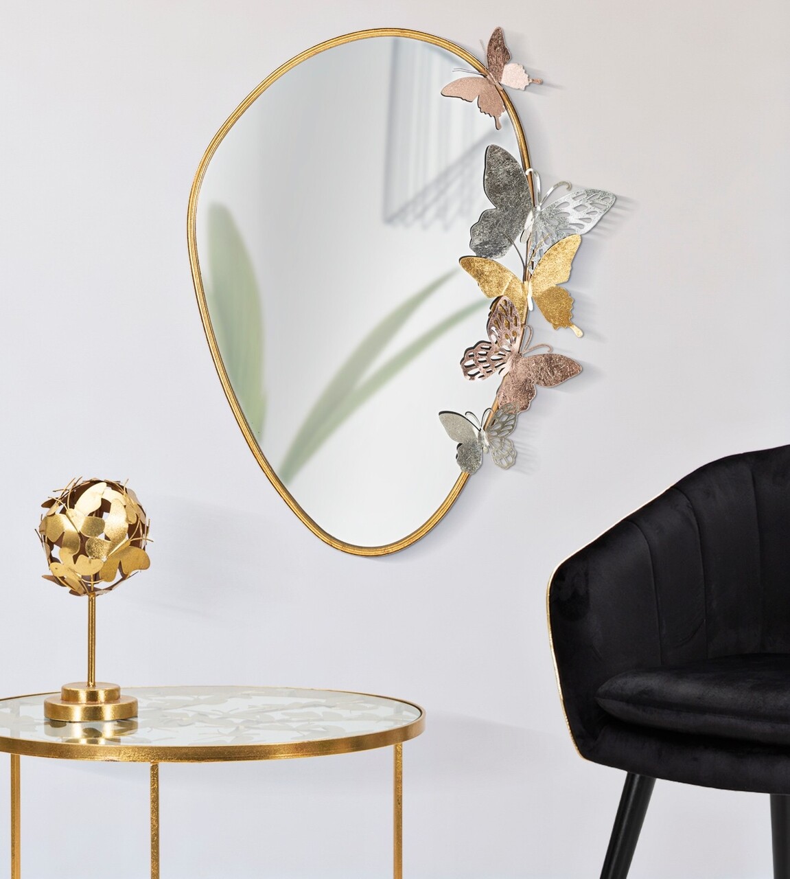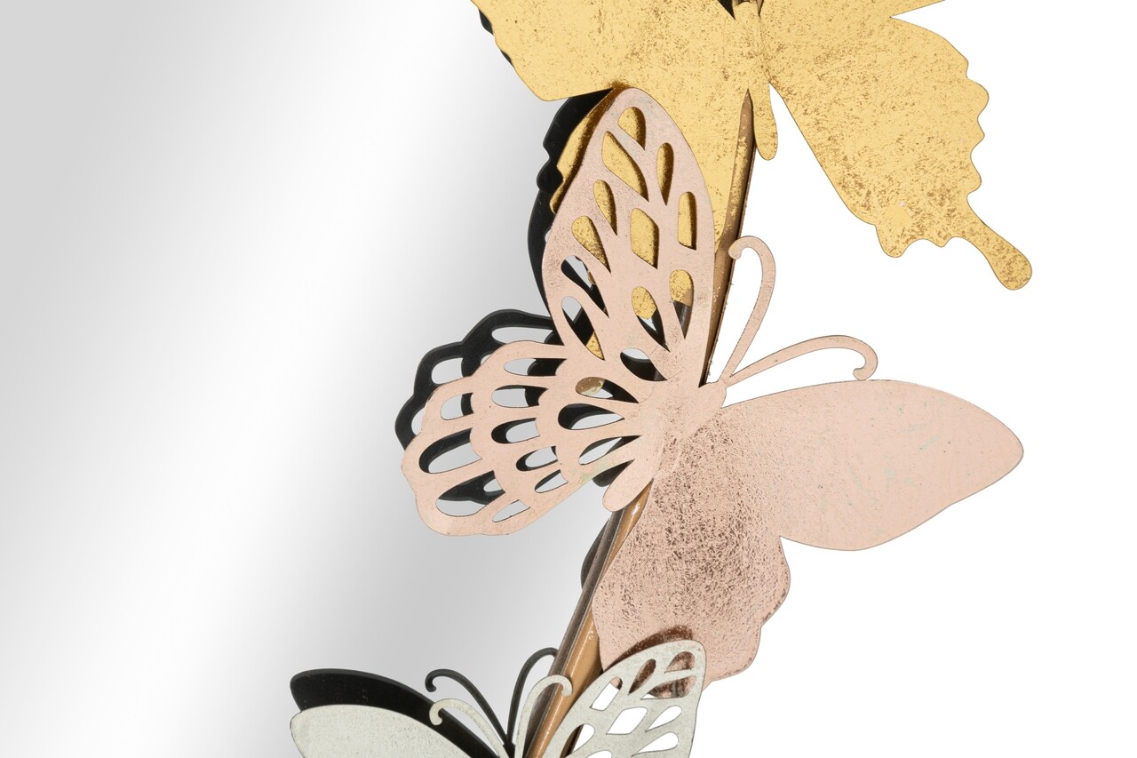 <p>Oglinda de perete cu rama simpla si liniara impodobita cu un zbor de fluturi multicolori.<br /><br />Compozitie material: fier, mdf, sticla.</p>