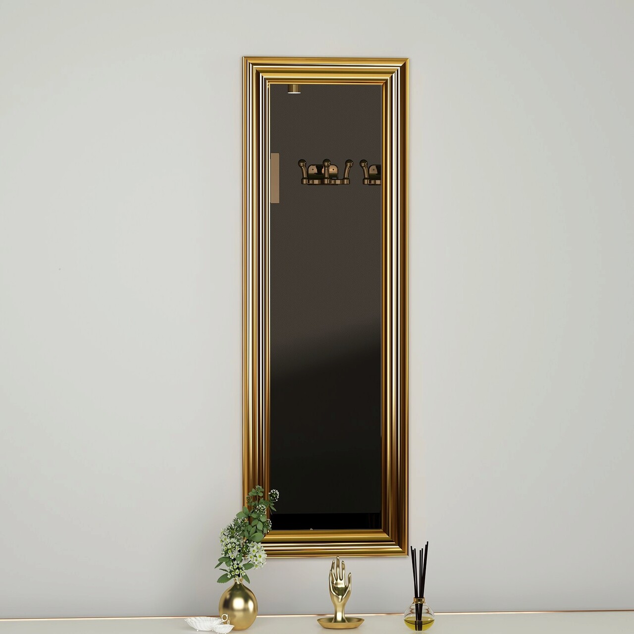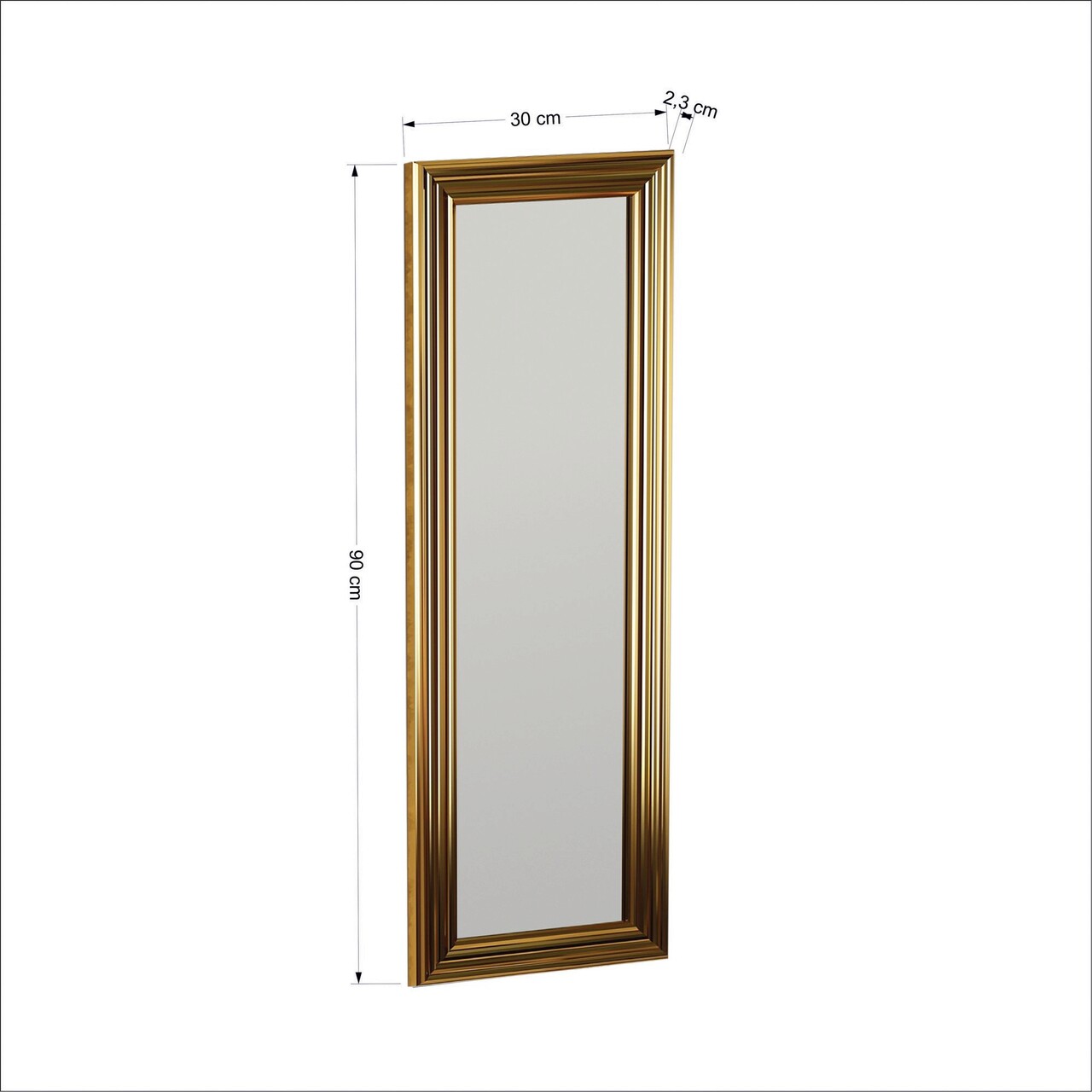 <p>Cadru: Laminat<br/><br/>Rama aurie<br/><br/>Oglinda dressing<br/><br/>Latime: 30 cm <br/> Inaltime: 90 cm <br/> Adancime: 3 cm<br/><br/>Oglinda ecologica Flotal-E<br/><br/>Poate fi fixat pe perete<br/></p>