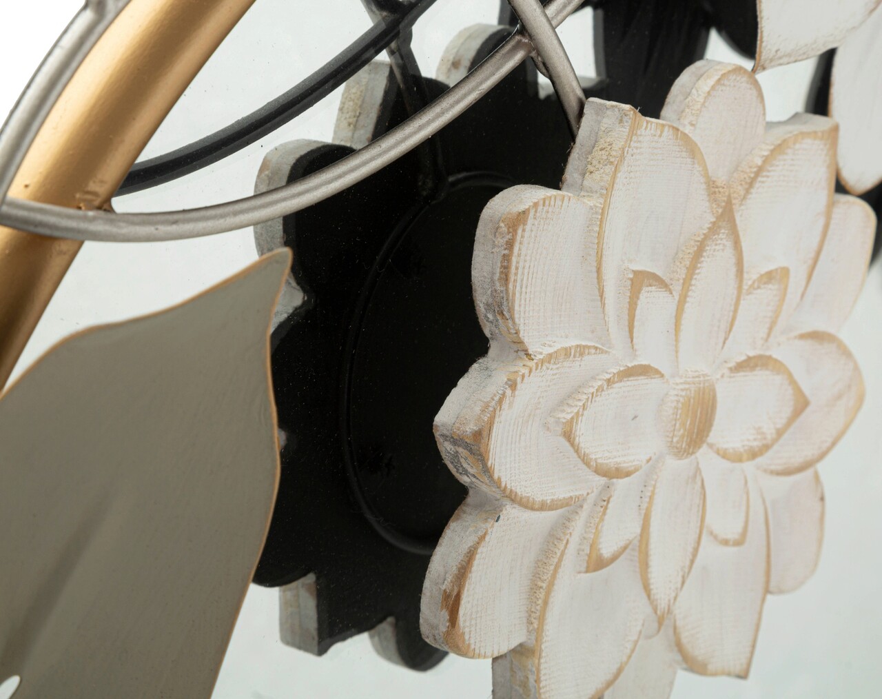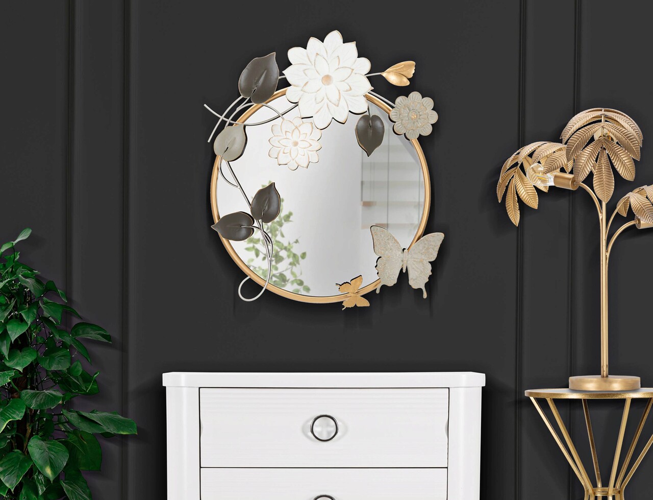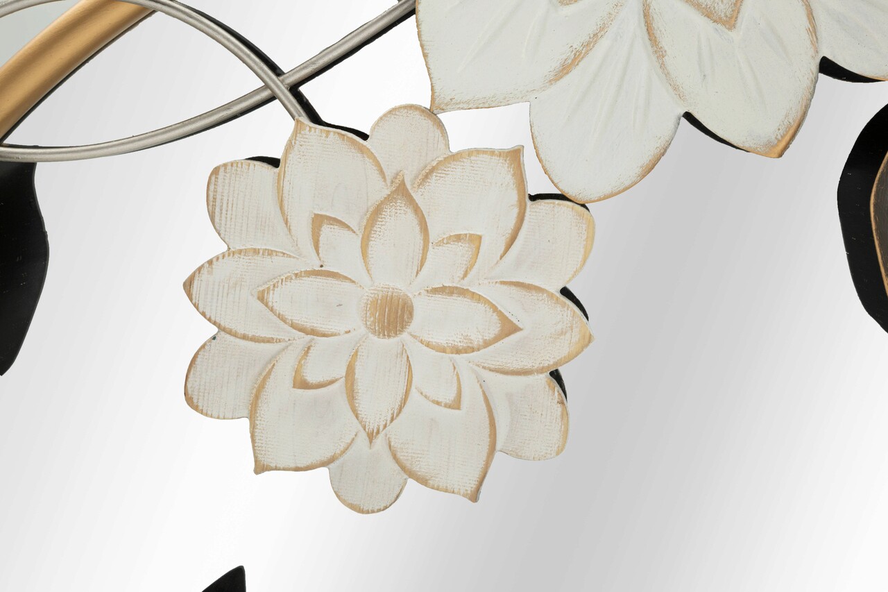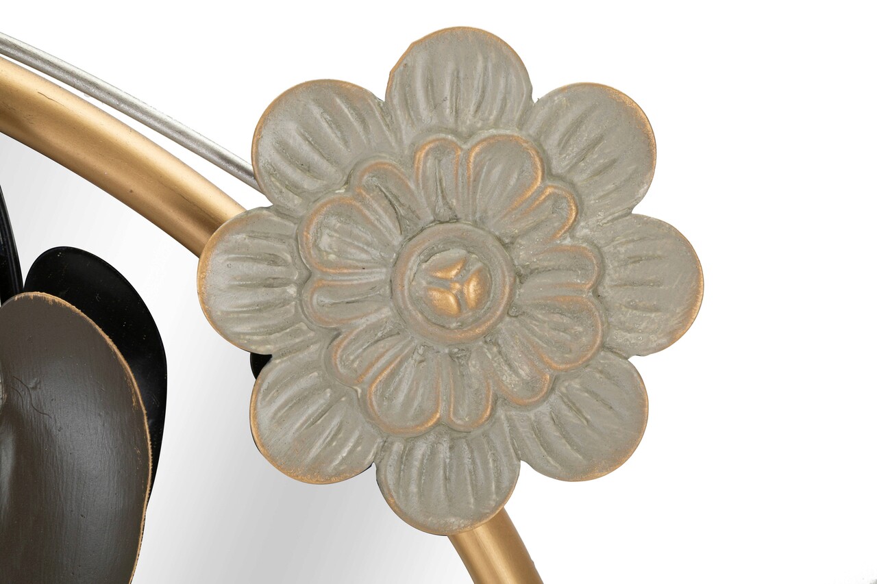 <p>Oglinda rotunda de perete cu rama aurita, impodobita cu flori, frunze si fluturi in diverse culori.</p>