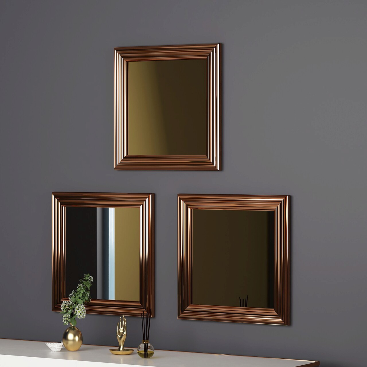 <p>Rama din bronz<br/><br/>Latime: 40 cm <br/> Inaltime: 40 cm <br/> Adancime: 3 cm<br/><br/>Oglinda ecologica Flotal-E<br/><br/>Poate fi fixat pe perete<br/></p>