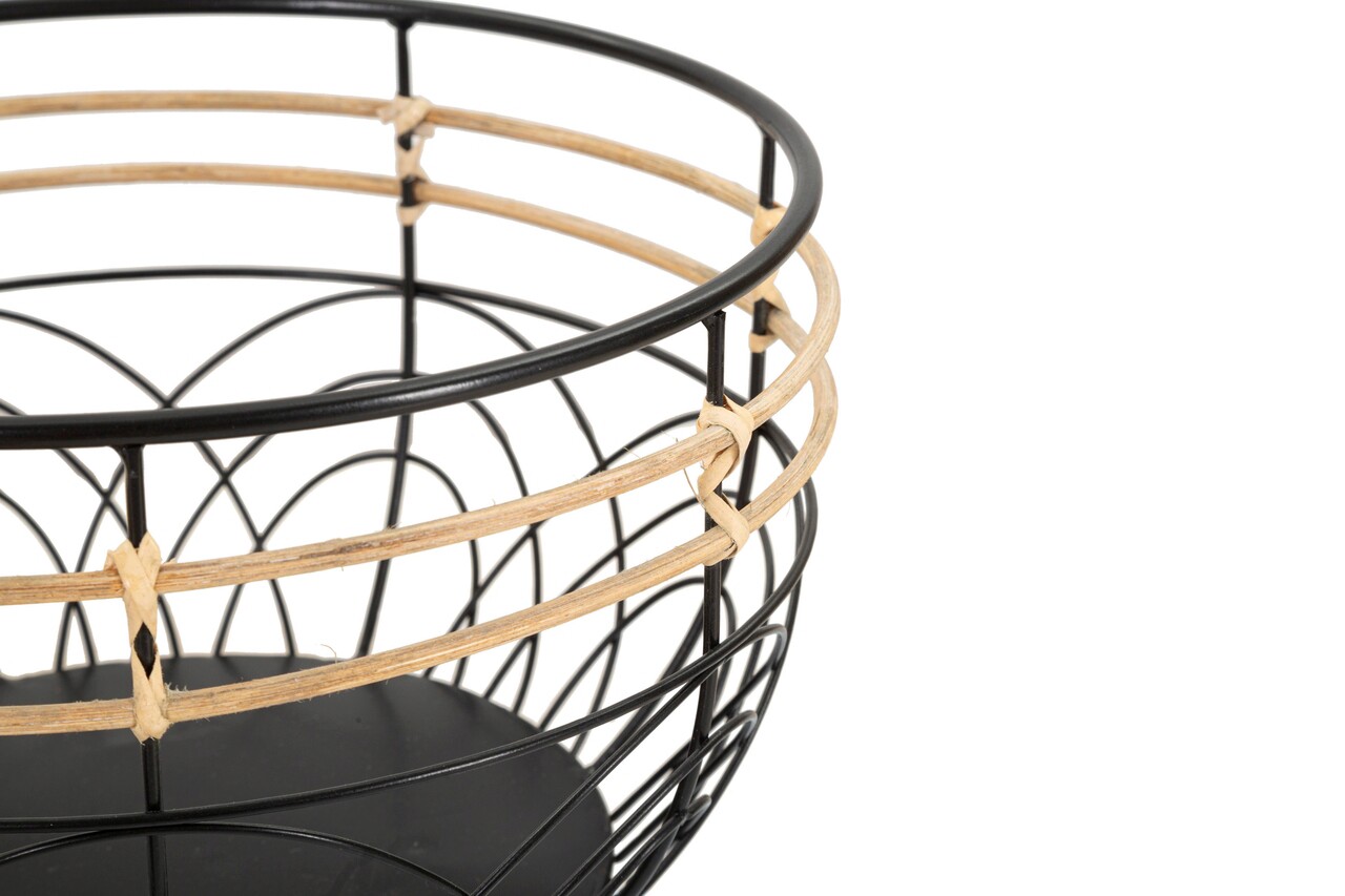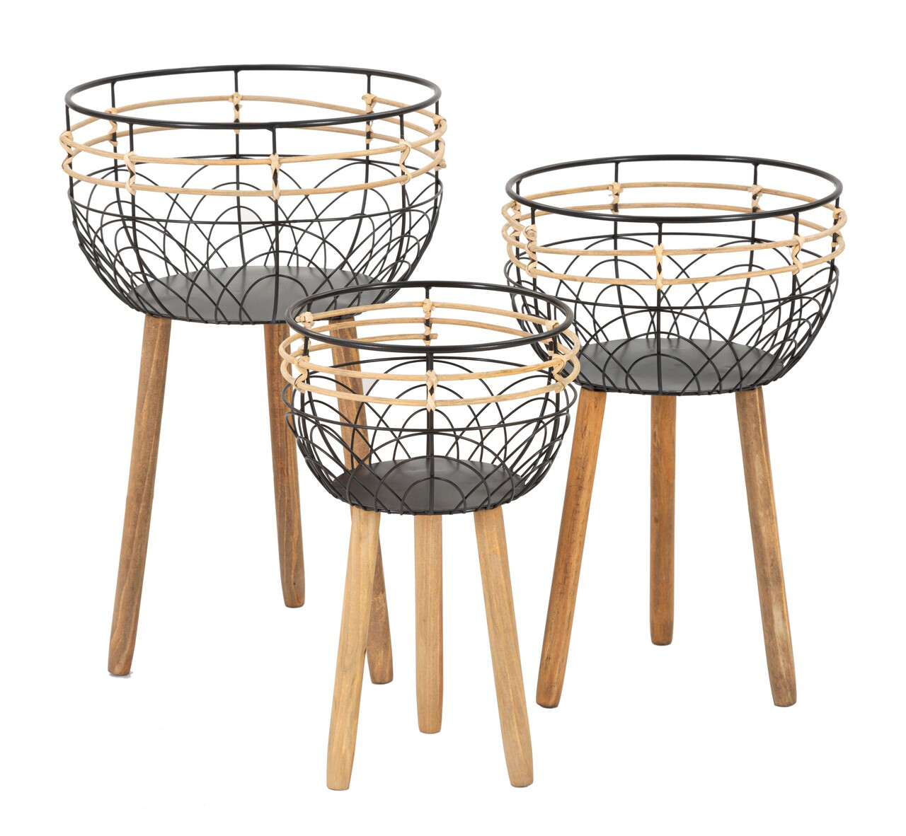 <p>Set de 3 suporturi rotunde pentru ghivece, cu picioare, de diferite dimensiuni. Eleganta metalului negru si finisajul din ratan creeaza o impletitura care, impreuna cu picioarele din lemn, formeaza un ansamblu armonios, potrivit pentru orice tip de mobilier.<br /><br /><strong>Mentiuni</strong><br />Compozitie material: fier, ratan, lemn de brad.<br /><br /><strong>Set</strong><br />1 suport ghiveci Ø 35 x 54.5 cm.<br />1 suport ghiveci Ø 30 x 48 cm.<br />1 suport ghiveci Ø 25 x 41.5 cm.</p>