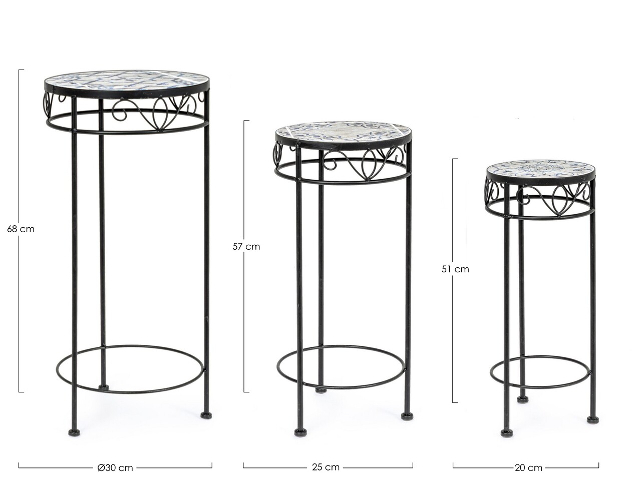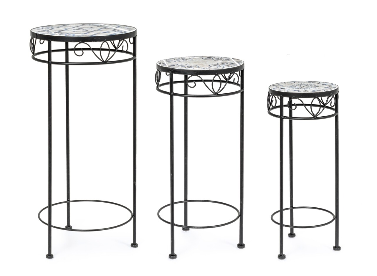 <p><strong>Mentiuni:</strong><br />Cadru din otel pentru utilizare in exterior (e-coating), acoperit cu pulbere epoxidica.<br />Blat ceramic.<br /><br /><strong>Setul include:</strong><br />1 suport pentru ghiveci cu dimensiunile Ø30 x 68 cm.<br />1 suport pentru ghiveci cu dimensiunile Ø25 x 57 cm.<br />1 suport pentru ghiveci cu dimensiunile Ø20 x 51 cm.</p>