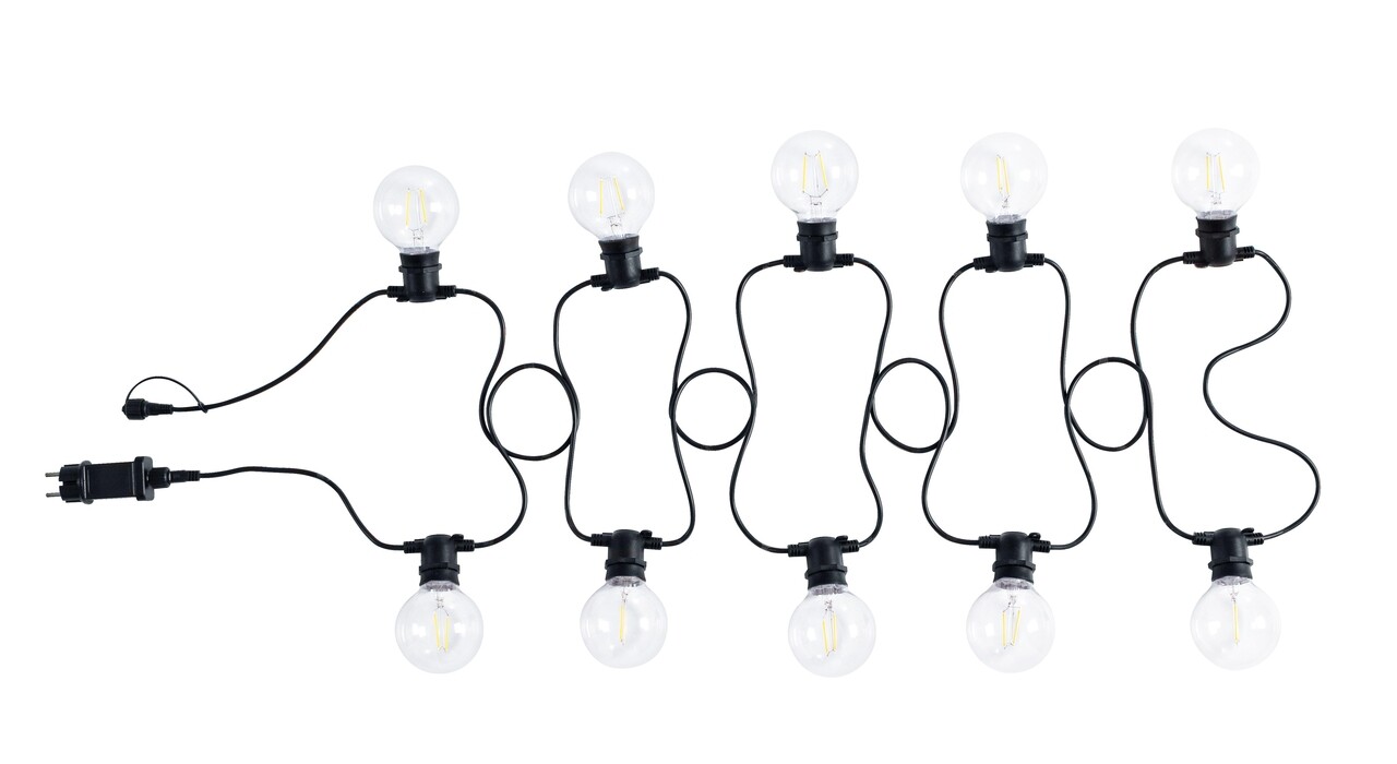 <p><strong>Mentiuni:</strong><br />Compozitie: cablu PVC, becuri.<br />Becuri cu LED (10X)E27 Max 0,3W (G80, Ø8), cu filament dublu, inclus. <br />Cablu negru, lungime totala 8,4Mt. <br />Distanta dintre un bec si celalalt: 50 cm.<br />Distanta dintre ultimul bec si capatul cablului: 3,6 m. <br />Cablu terminal: 30Cm.<br />Extensibila: se poate atasa inca o ghirlanda. <br />Becuri inlocuibile disponibile. <br />Utilizare in interior si exterior, Ip44.</p>