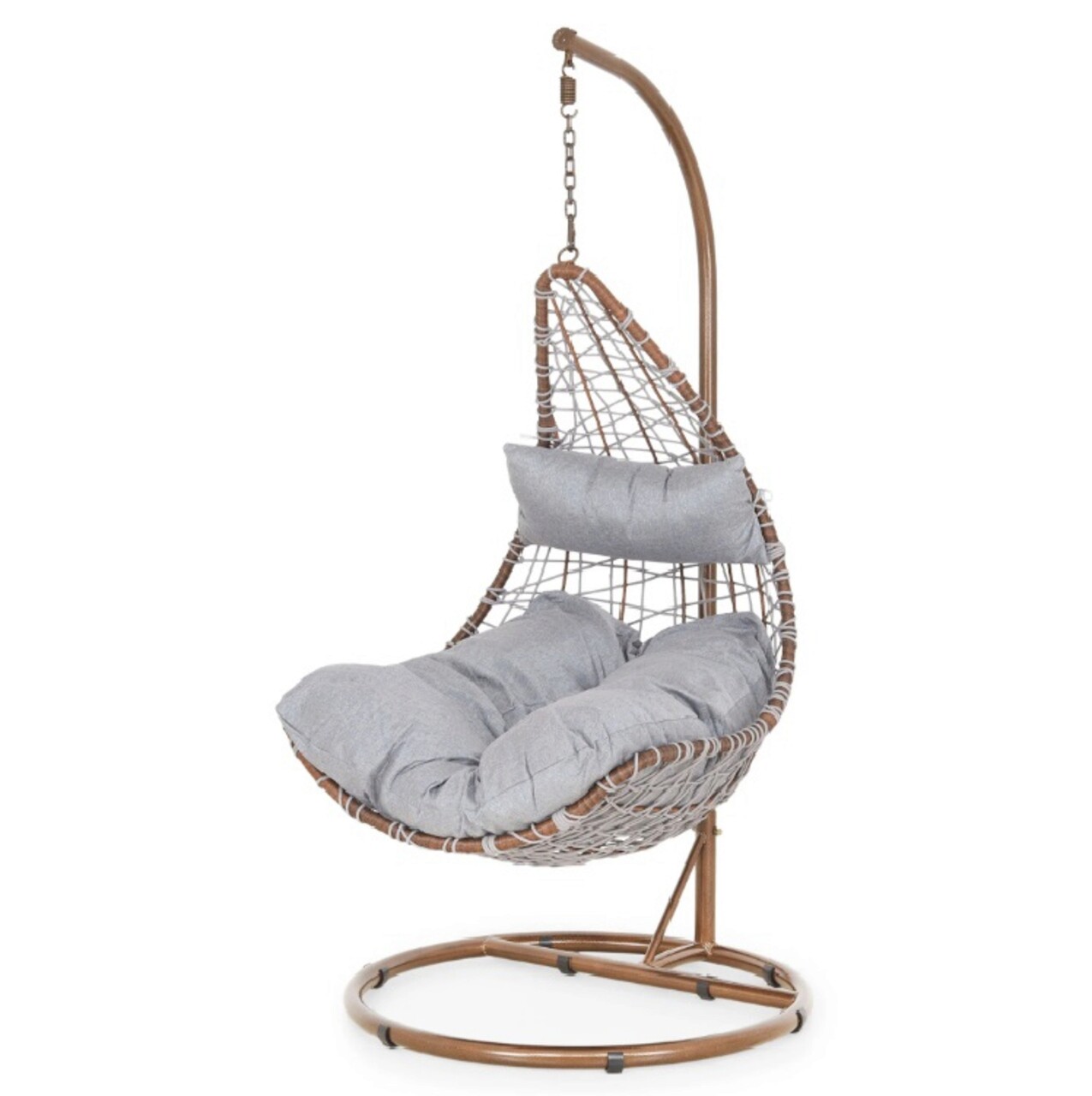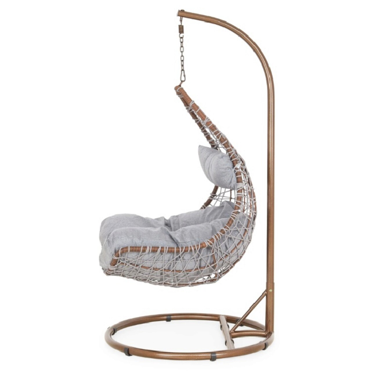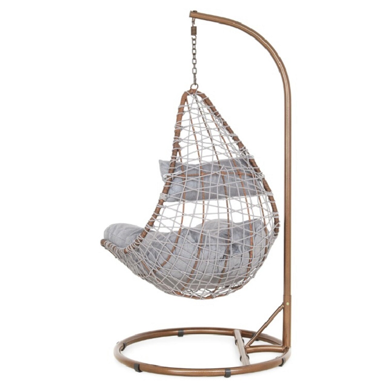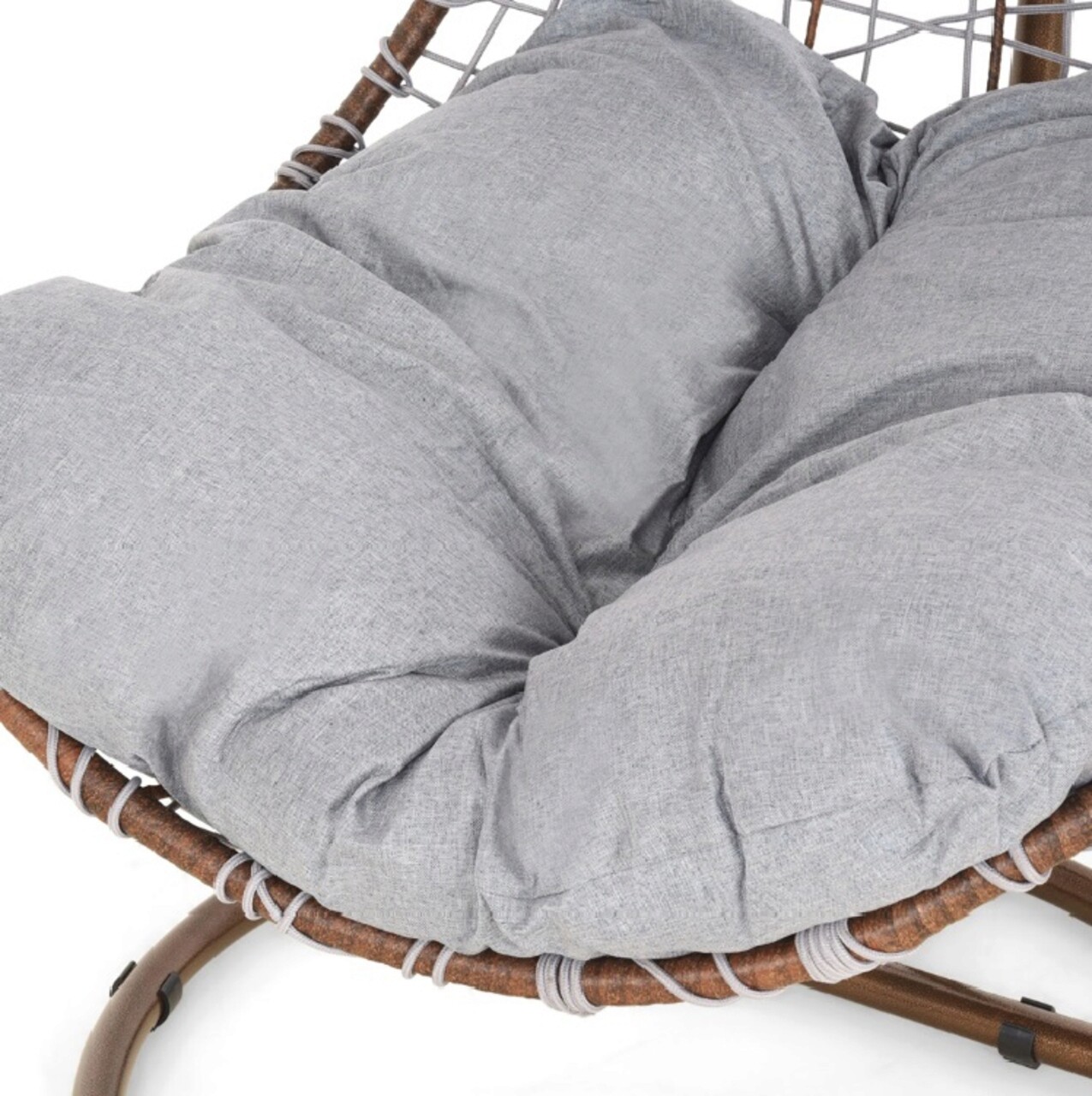 <p>Realizat din structura din otel vopsit in camp electrostatic si impletit cu fibre din poliester ce imita funia cu protectie UV. Include perna din poliester.<br />Diametrul bazei este de 95 cm.<br />Suporta o greutate de 150 kg.<br />Accesoriile de fixare a leaganului (arc, suruburi etc) se gasesc in interiorul tevii mici de la baza (cerc).</p>