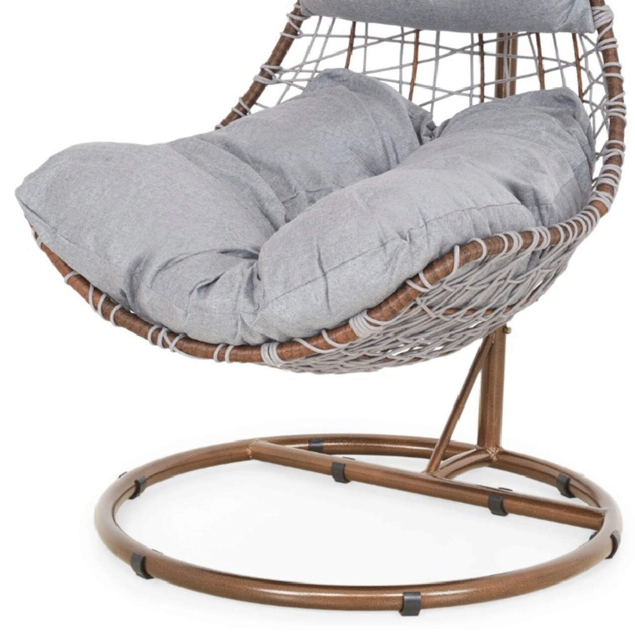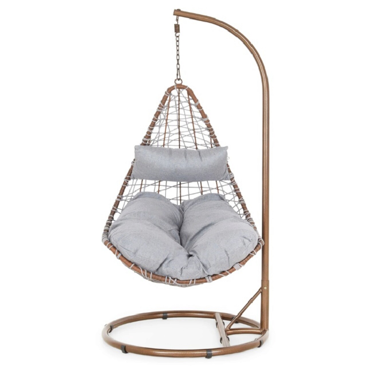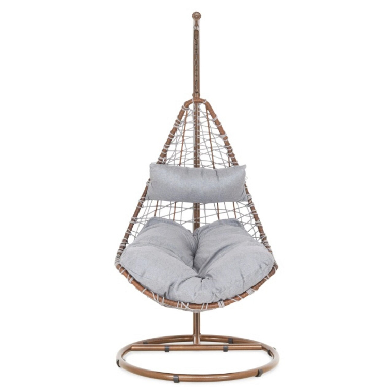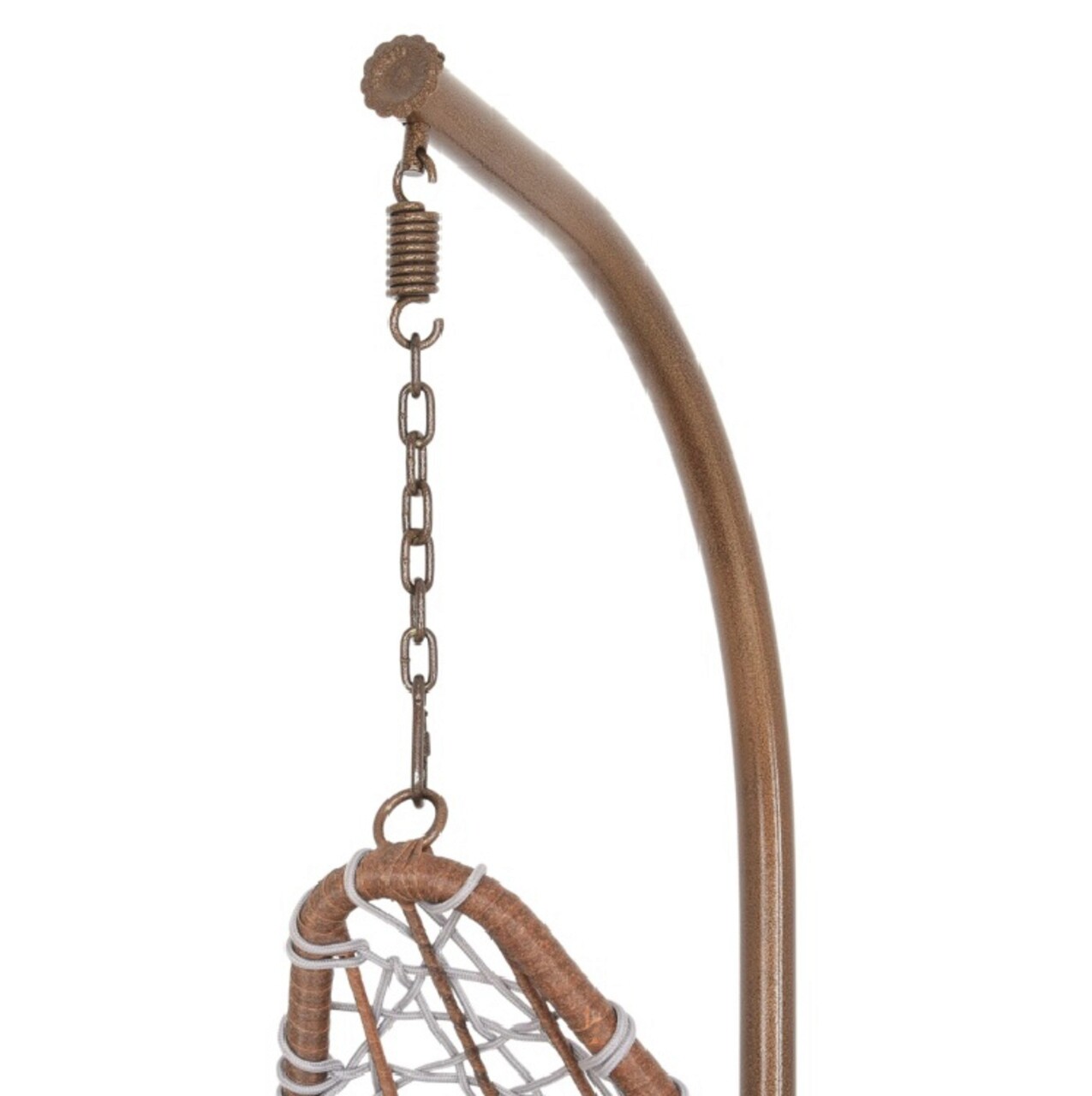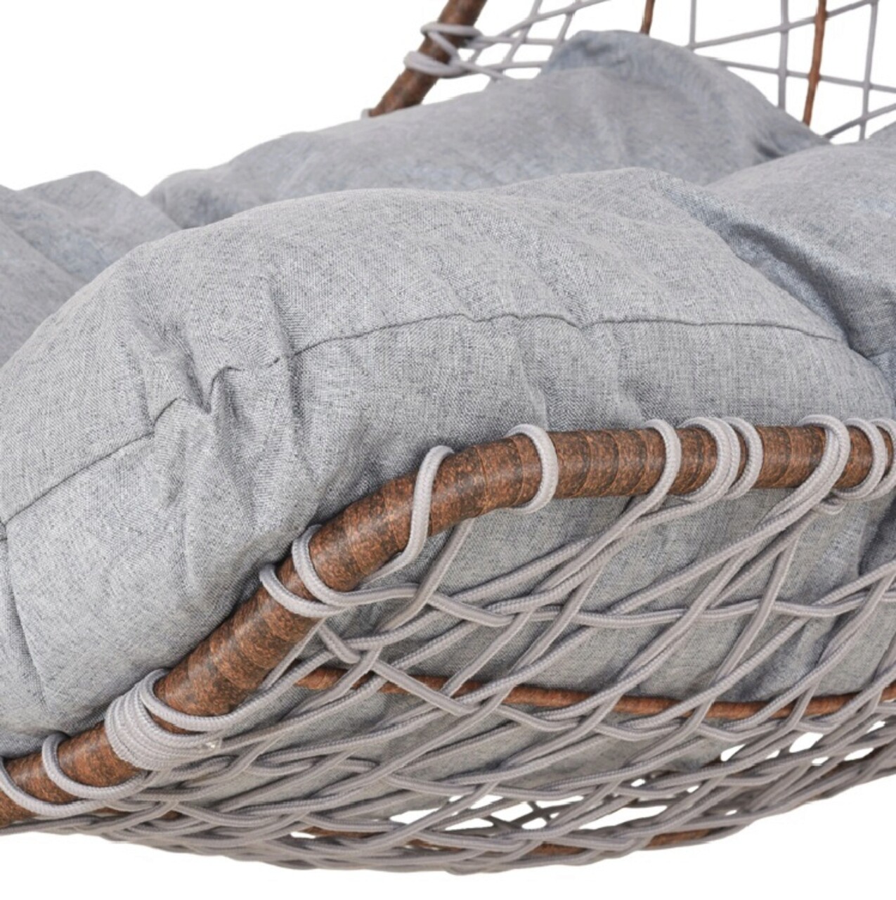<p>Realizat din structura din otel vopsit in camp electrostatic si impletit cu fibre din poliester ce imita funia cu protectie UV. Include perna din poliester.<br />Diametrul bazei este de 95 cm.<br />Suporta o greutate de 150 kg.<br />Accesoriile de fixare a leaganului (arc, suruburi etc) se gasesc in interiorul tevii mici de la baza (cerc).</p>
