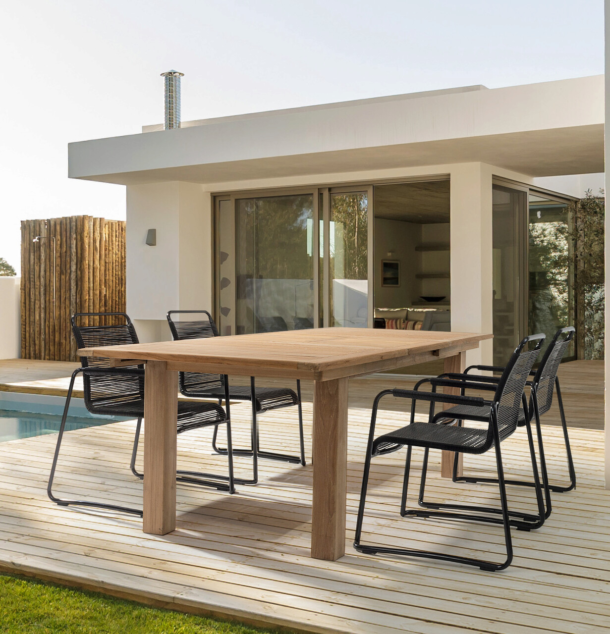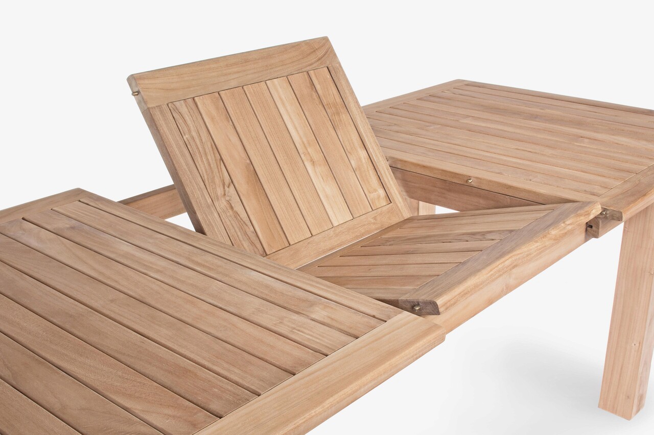 <p><strong>Mentiuni</strong><br />Lemn de tec (clasa A) – Svlk (lemn indonezian legal). Productie mecanica.<br />Feronerie din otel galvanizat. <br />Picioare 10×10 cm. <br />Necesita asamblarea picioarelor.<br />Masa este extensibila: 180-240 cm.</p>