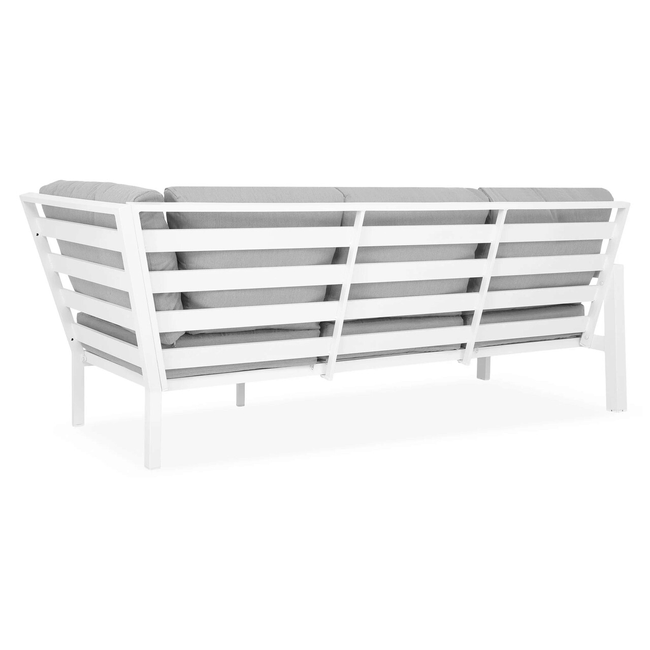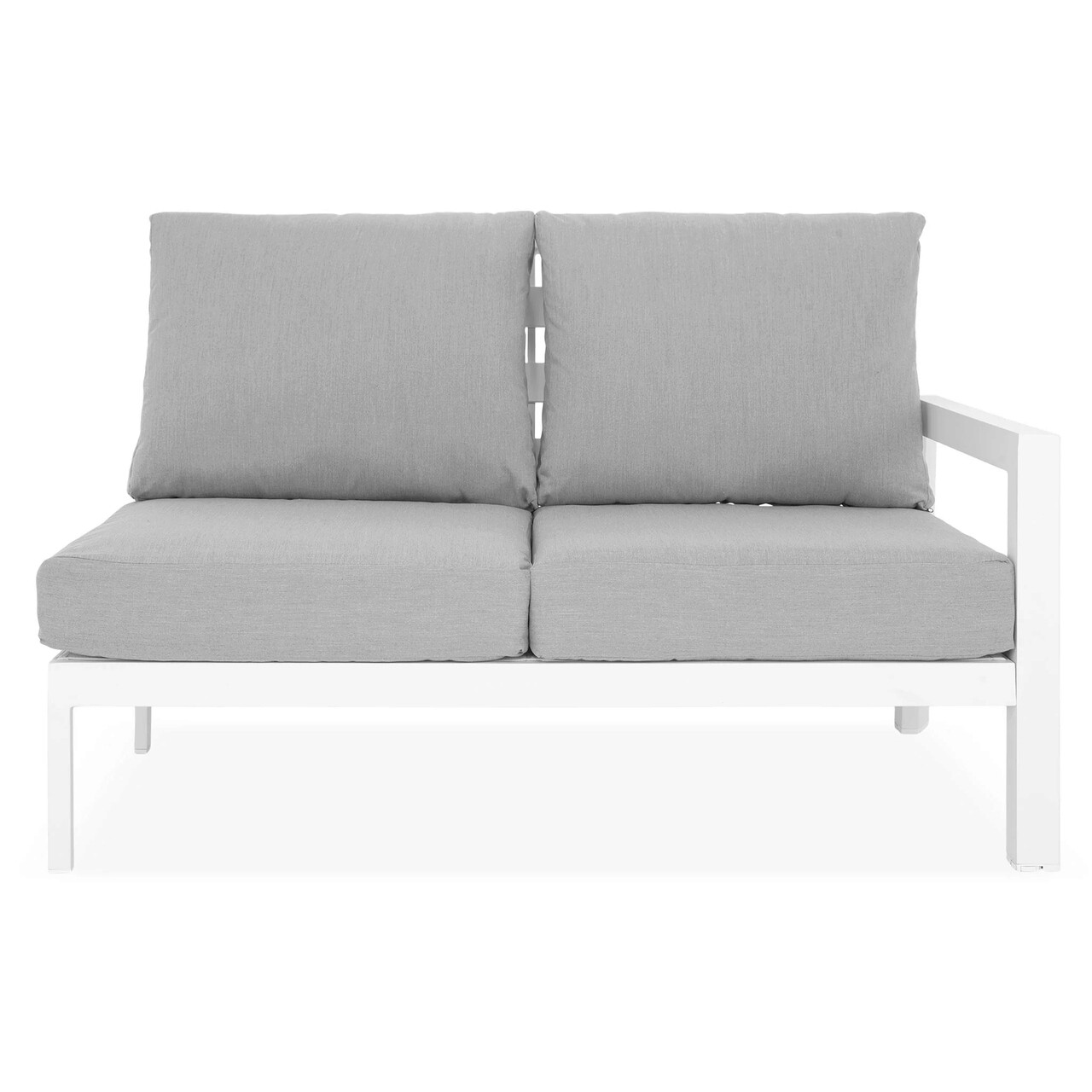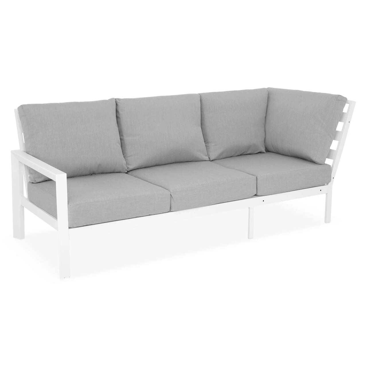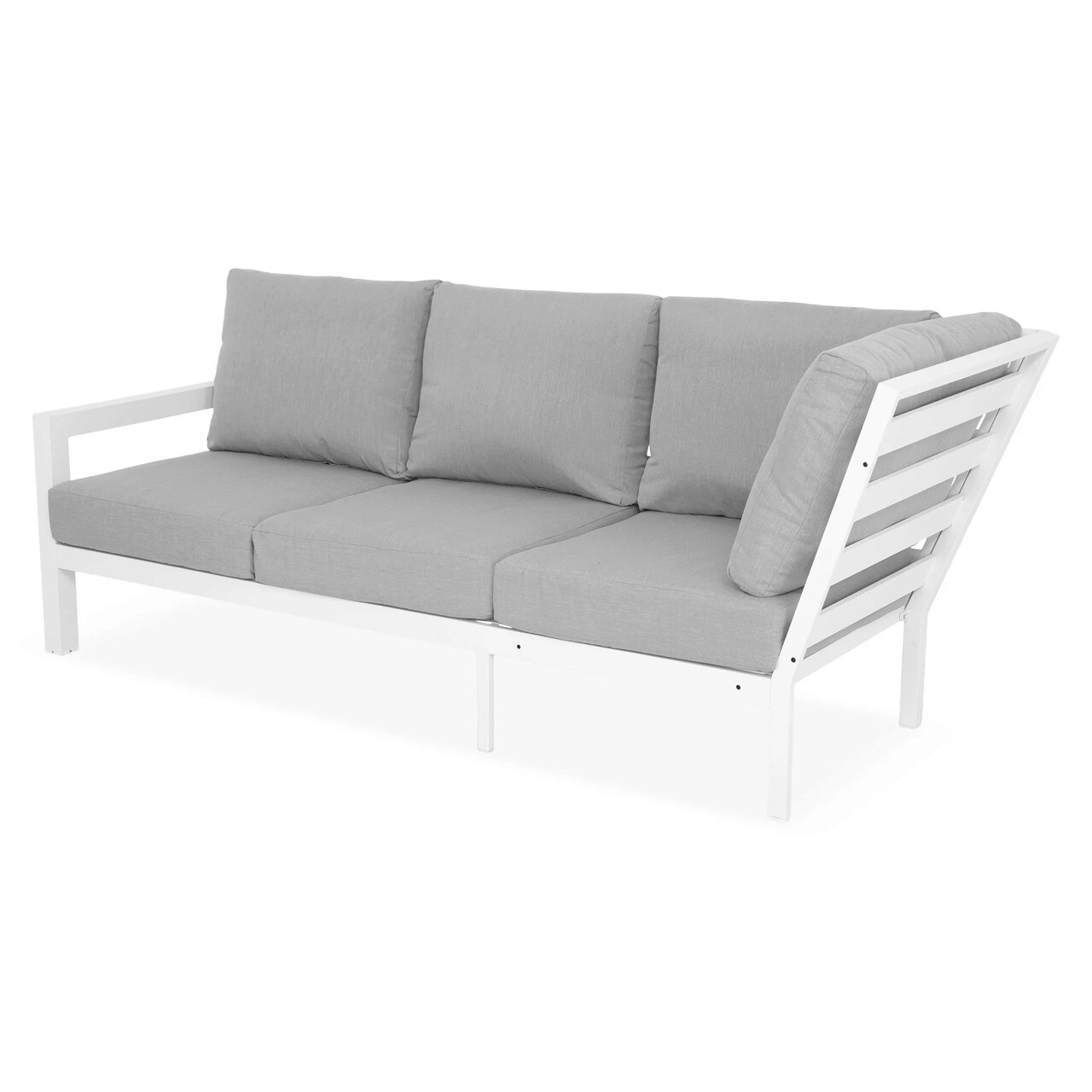 <p>Realizat din structura solida de aluminiu vopsita in camp electrostatic. Include perne imbracate cu tesatura Olefin cu protectie impotriva umezelii si a razelov UV. Husele sunt prevazute cu fermoar pentru a fi mai usor de indepartat si curatat.<br />Dimensiuni : <br />Canapea 3 locuri: 223.5x88x87 cm<br />Canapea 2 locuri cu brat dreapta: 136x88x87 cm<br />Masuta: 80x80x40 cm</p>