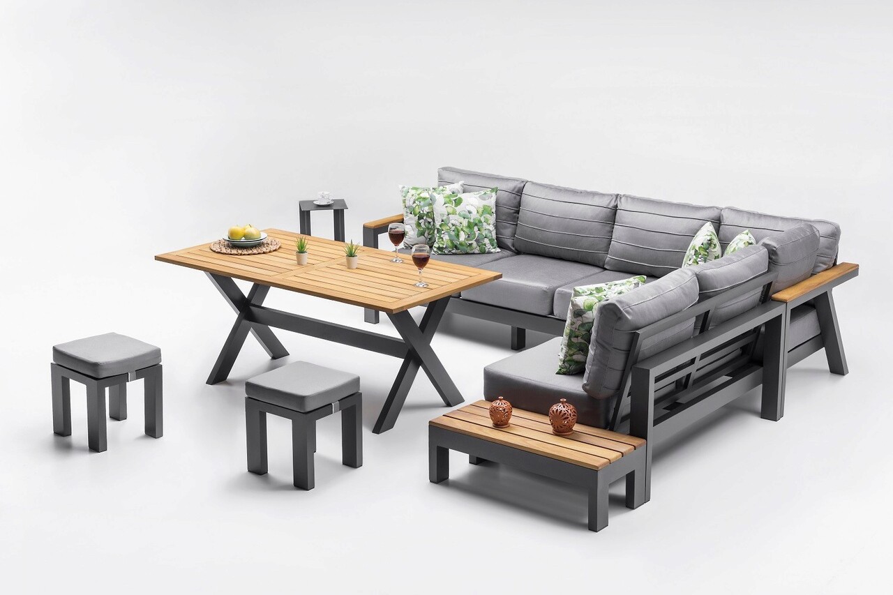 <p>Structura mobilierului este realizată 100% din aluminiu.<br />Blatul mesei este realizat din lemn de Iroko.<br />Pernele și structura au un finisaj antracit.<br />Umplutura cu fibre a pernelor.<br />Modulul canapelei din dreapta măsoară 260 cm lățime x 70 cm înălțime x 50 cm adâncime.<br />Modulul canapea din stânga măsoară 200 cm lățime x 70 cm înălțime x 50 cm adâncime.<br />Capacitate canapea: 250 kg.<br />Masa masoara 140 cm latime x 55 cm inaltime x 80 cm adancime.<br />Masa laterala masoara 45 cm latime x 27 cm inaltime x 28 cm adancime.<br />Scaunelele măsoară 35 cm lățime x 35 cm înălțime x 35 cm adâncime.<br />Capacitatea scaunele: 120 kg.<br />Produsul este livrat în două pachete cu următoarele greutăți și dimensiuni:<br />Pachetul 1: 265 cm lățime x 205 cm înălțime x 75 cm adâncime și cântărește 75 kg.<br />Pachetul 2: 85 cm lățime x 145 cm înălțime x 60 cm adâncime și cântărește 45 kg.</p>