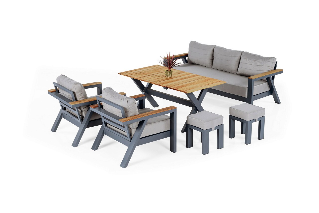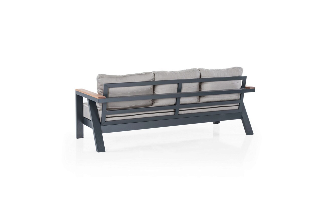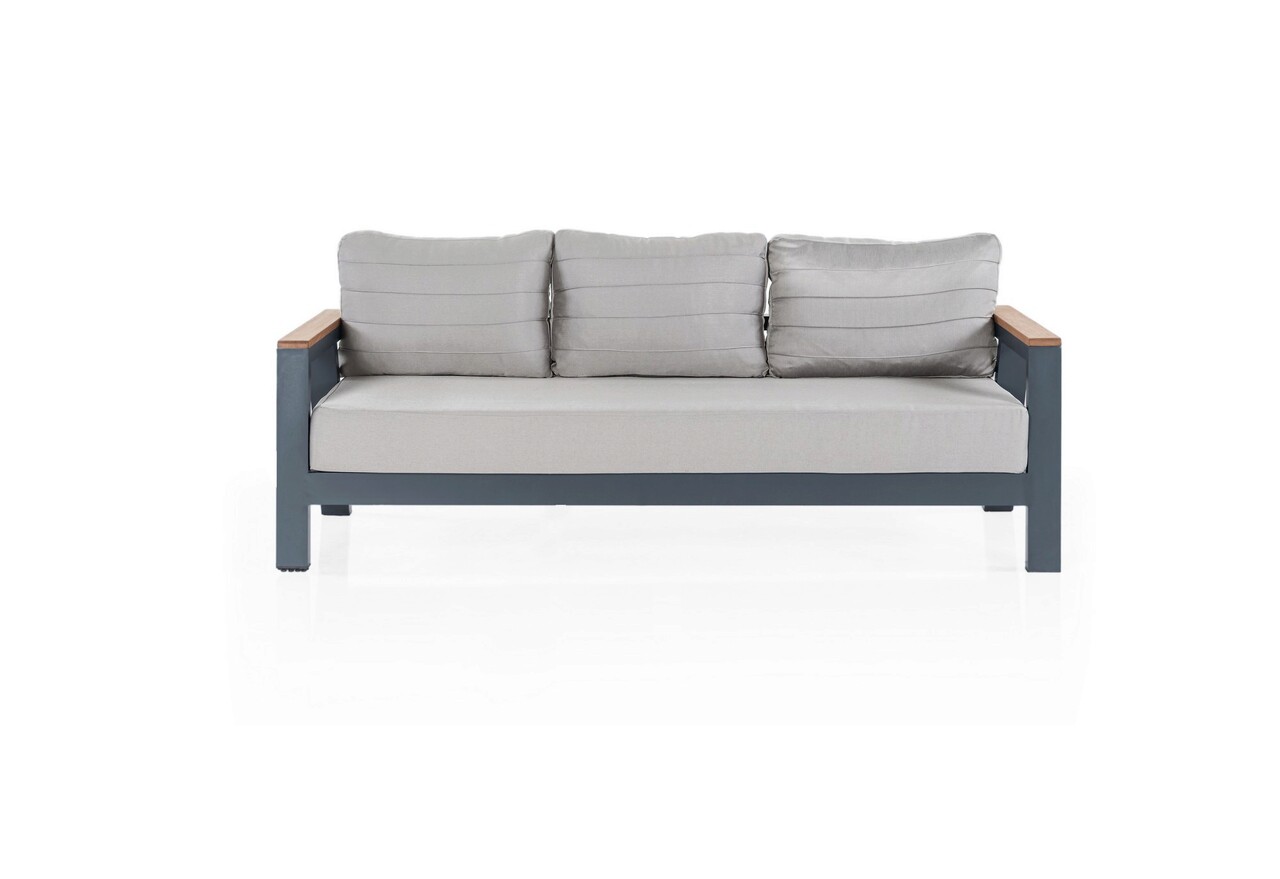 <p>Setul de mobilier constă dintr-o vanapea fixa cu trei locuri, două scaune de un singur loc, o masă și două scaunele.<br />Structura este din aluminiu.<br />Structura și pernele au un finisaj antracit.<br />Suprafața mesei este realizată 100% din lemn de Iroko.<br />Umplutura pernelor este din fibre.<br />Canapeaua fixa cu trei locuri măsoară 196 cm lățime x 60 cm înălțime x 81 cm adâncime.<br />Capacitatea de încărcare a canapelei este de 250 kg.<br />Fotoliile măsoară 76 cm lățime x 60 cm înălțime x 81 cm adâncime.<br />Capacitatea fotolii este de 150 kg.<br />Masa masoara 140 cm latime x 55 cm inaltime x 80 cm adancime.<br />Scaunelele măsoară 35 cm lățime x 35 cm înălțime x 35 cm adâncime.<br />Setul este livrat în patru pachete cu următoarele dimensiuni și greutăți:<br />Pachetul 1: 80 cm lățime x 85 cm înălțime x 65 cm adâncime, iar greutatea sa este de 20 kg.<br />Pachetul 2: 200 cm lățime x 85 cm înălțime x 65 cm adâncime și cântărește 35 kg.<br />Pachetul 3: 75 cm lățime x 85 cm înălțime x 20 cm adâncime și cântărește 15 kg.<br />Pachetul 4: 70 cm lățime x 85 cm înălțime x 40 cm adâncime și cântărește 20 kg.</p>