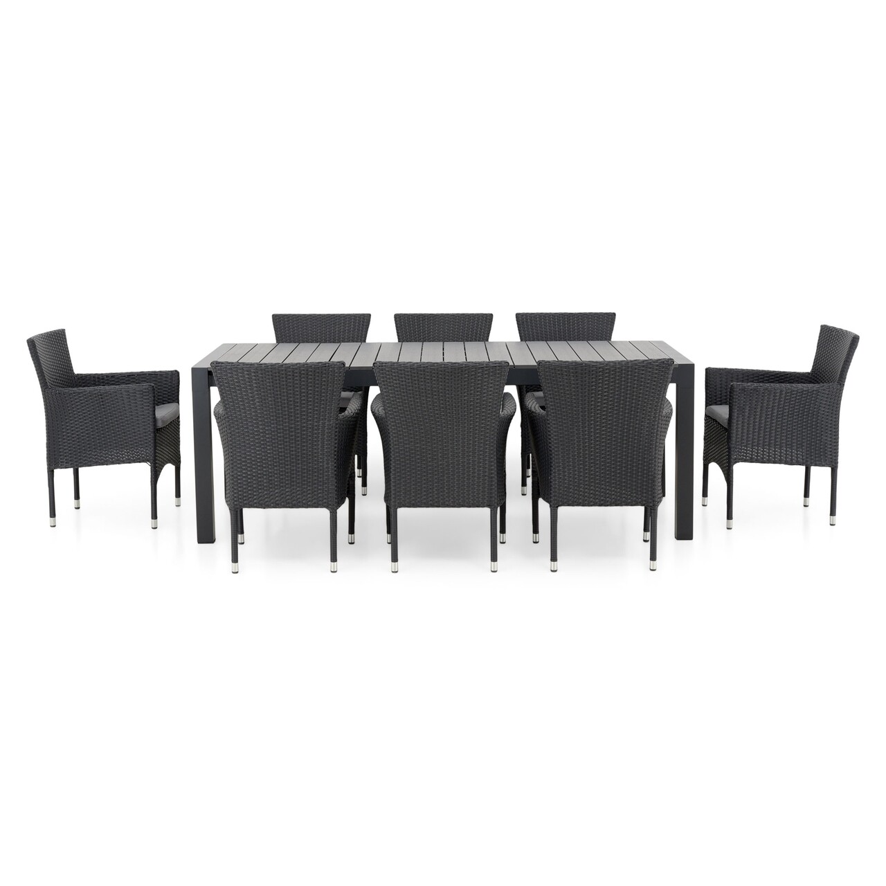 <p>Piesele setului sunt realizate din aluminiu vopsit in camp electrostatic, topul fiind realizat din imitatie de lemn cu protectie UV. Scaunele au structura de otel vopsita in camp electrostatic si impletita cu fibre sintetice tratate UV. Includ perne din poliester rezistent la umezeala.<br />Setul este format din: masa: L.213 x l.95 x H.77 cm; 8 scaune L.60 x l.63 x H.86 cm.</p>