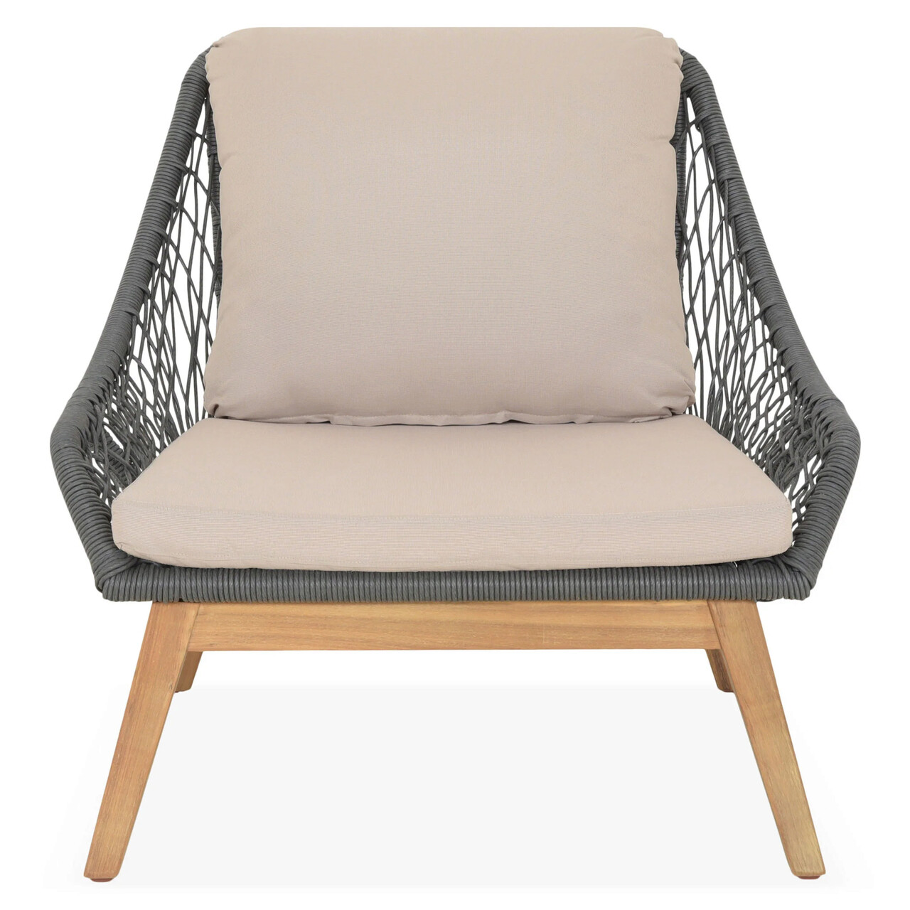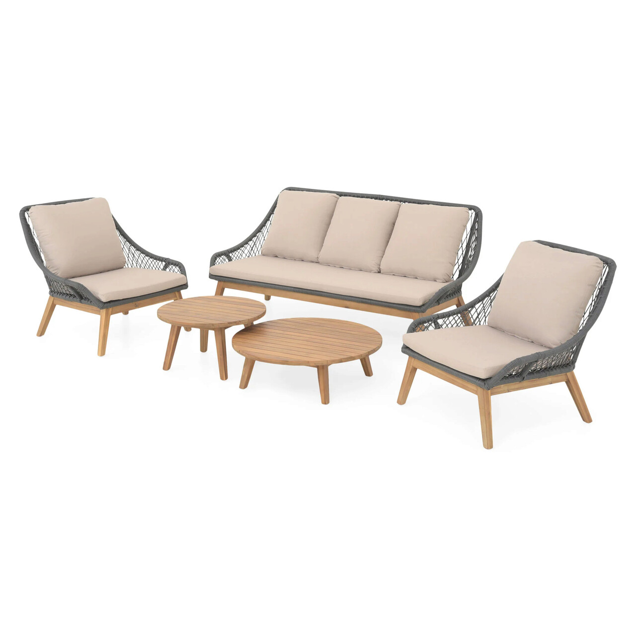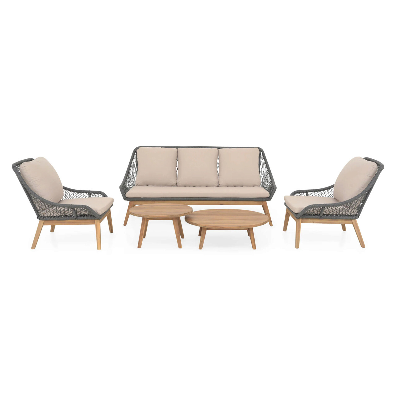 <p>Realizat din structura solida de aluminiu vopsita in camp electrostatic si lemn masiv acacia, impletita cu fibre sintetice tip sfoara cu protectie UV. Include perne din tesatura Olefin cu protectie impotriva umezelii si a decolorarii. Masutele sunt realizate din lemn masiv acacia. <br />Dimensiuni:<br />2 fotolii 81x81x78.5 cm<br />1 bancheta 174x81x78.5 cm<br />1 masuta mare 80x80x25 cm<br />1 masuta mica 60x60x33 cm</p>