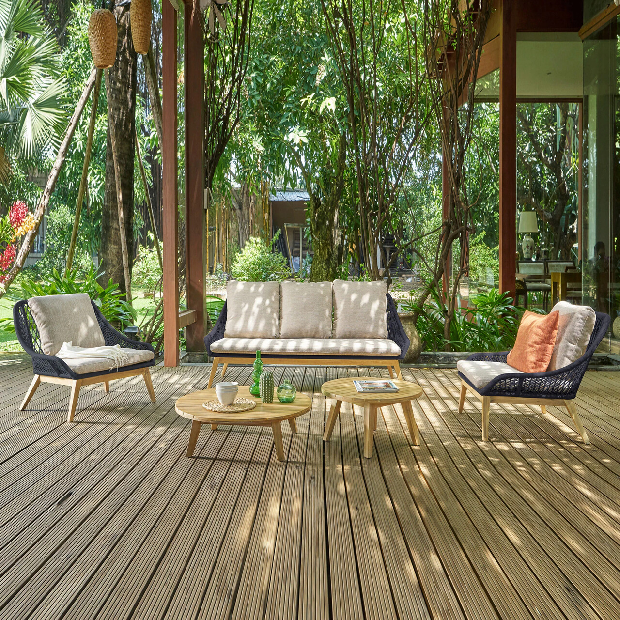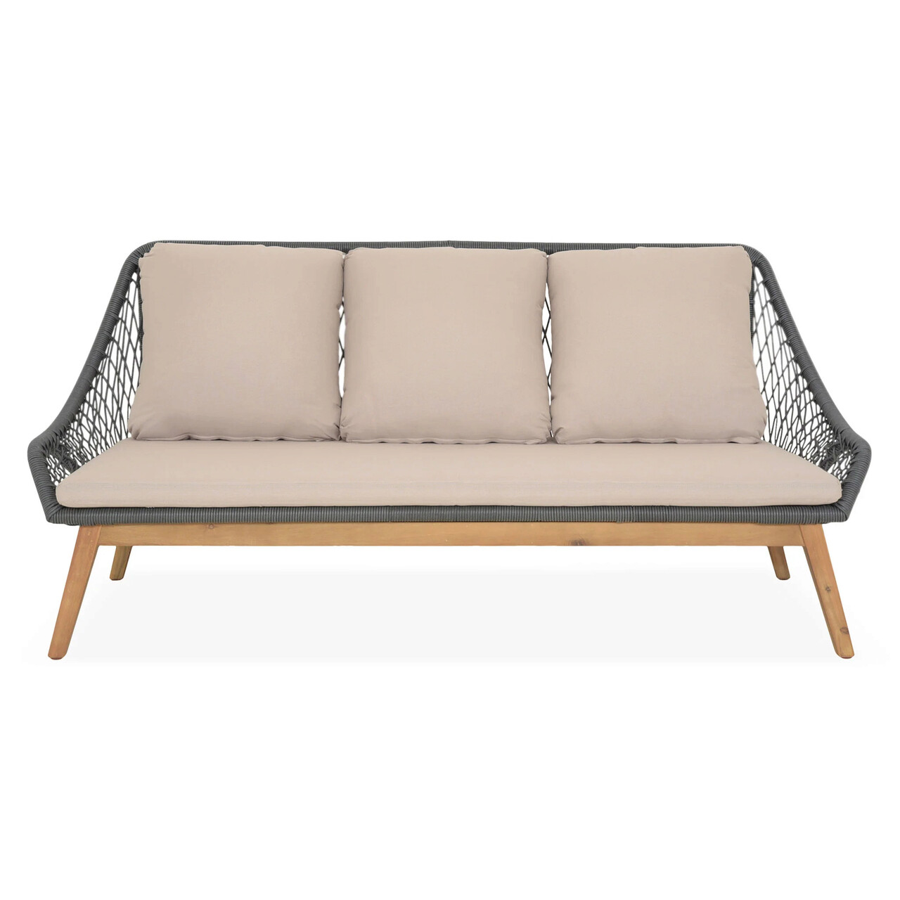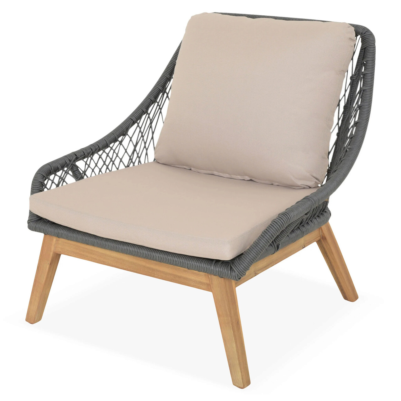 <p>Realizat din structura solida de aluminiu vopsita in camp electrostatic si lemn masiv acacia, impletita cu fibre sintetice tip sfoara cu protectie UV. Include perne din tesatura Olefin cu protectie impotriva umezelii si a decolorarii. Masutele sunt realizate din lemn masiv acacia. <br />Dimensiuni:<br />2 fotolii 81x81x78.5 cm<br />1 bancheta 174x81x78.5 cm<br />1 masuta mare 80x80x25 cm<br />1 masuta mica 60x60x33 cm</p>
