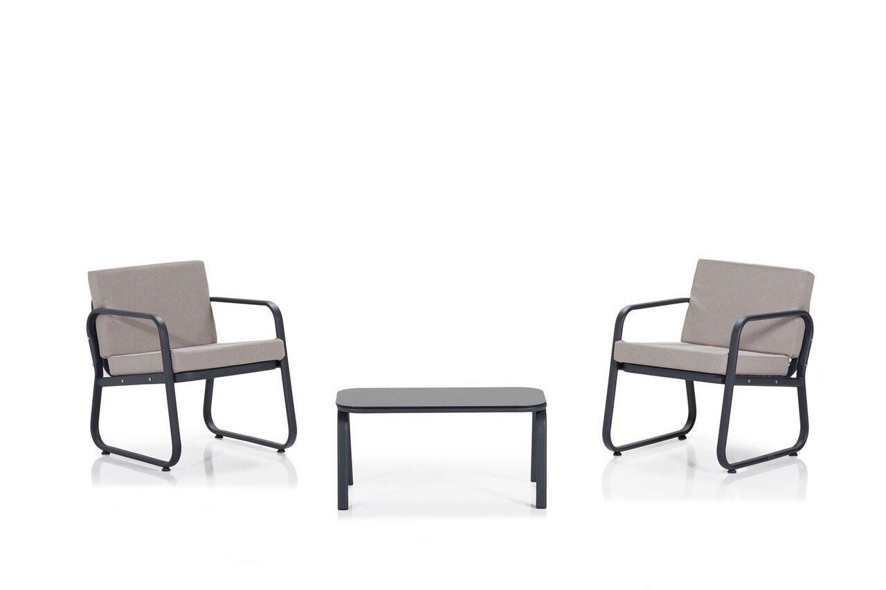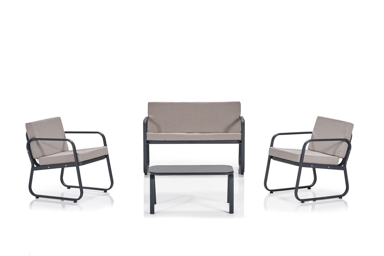 <p><strong>Set</strong><br />1 canapea de 2 locuri cu dimensiunea de 118x63x77 cm <br />1 masuta de cafea cu dimensiunea de 80x50x66 cm <br />2 scaune cu dimensiunea de 63x63x77 cm</p>