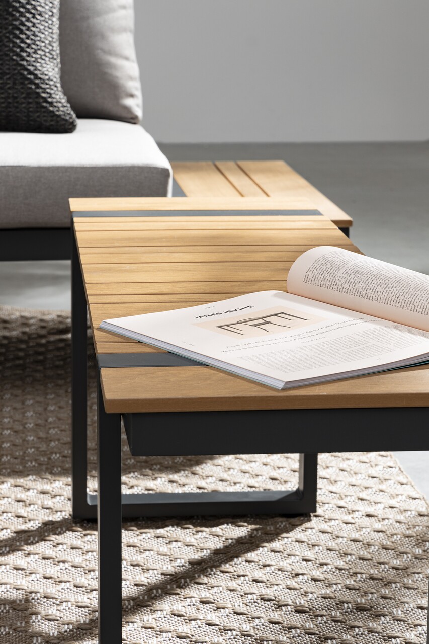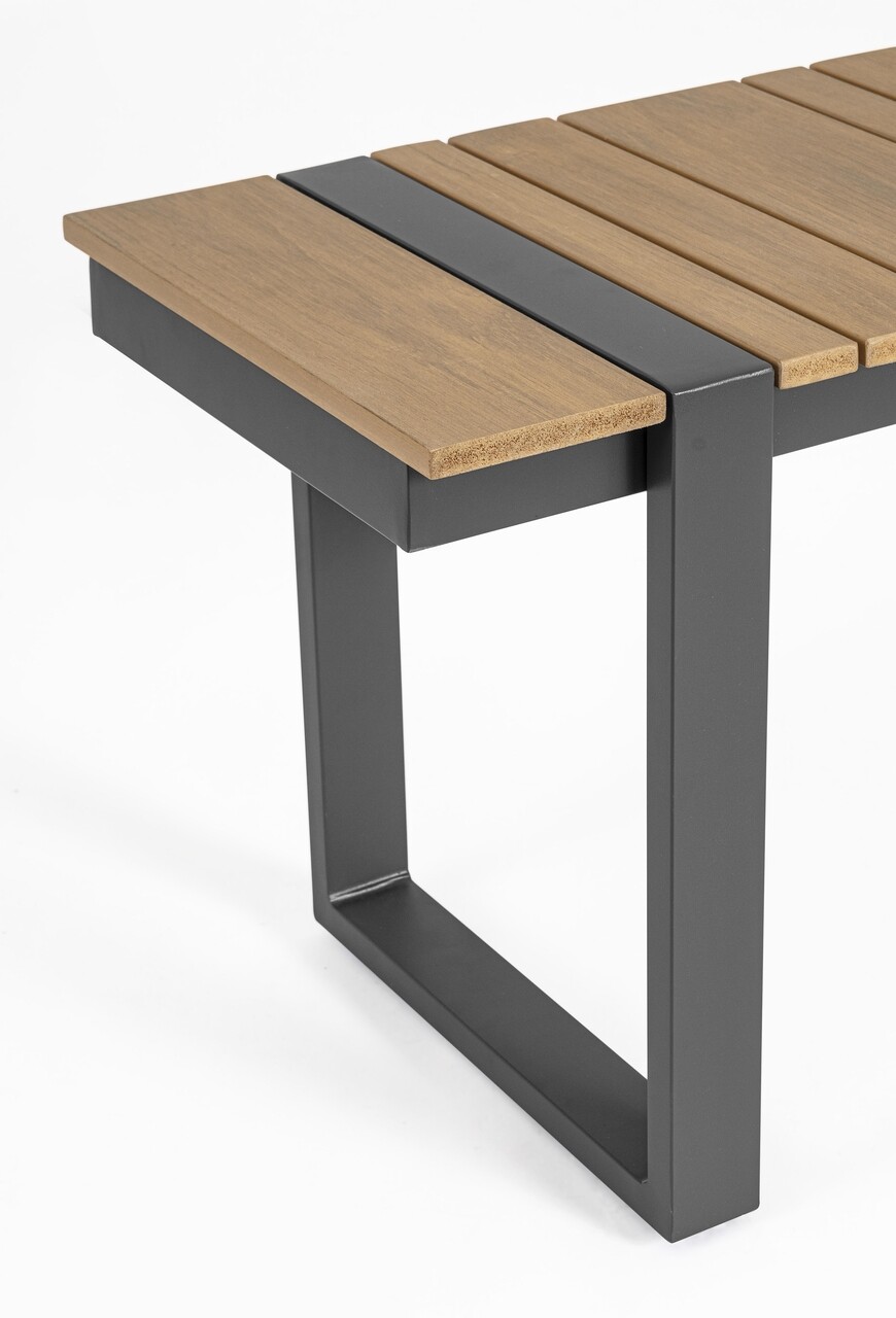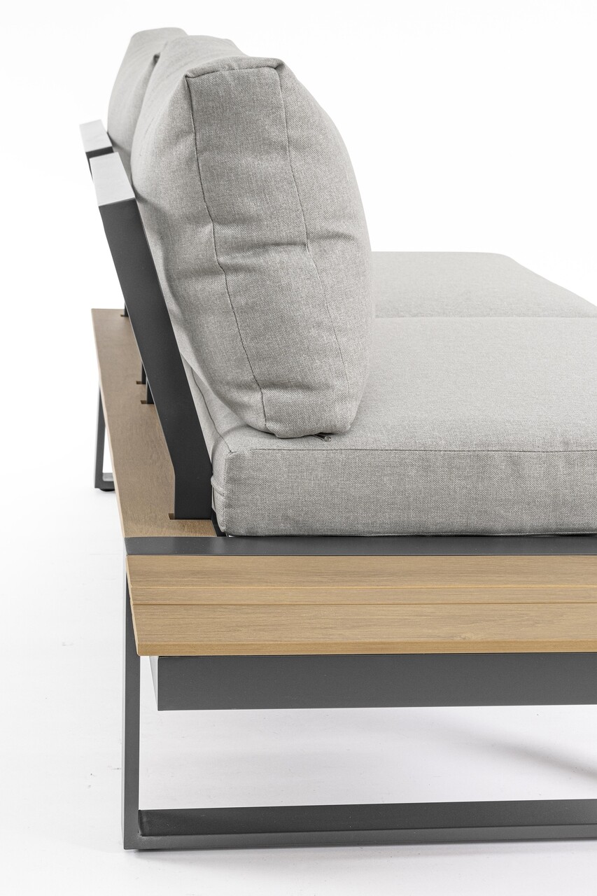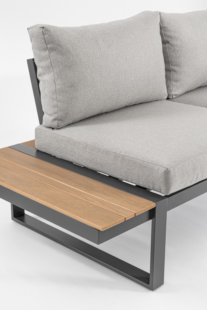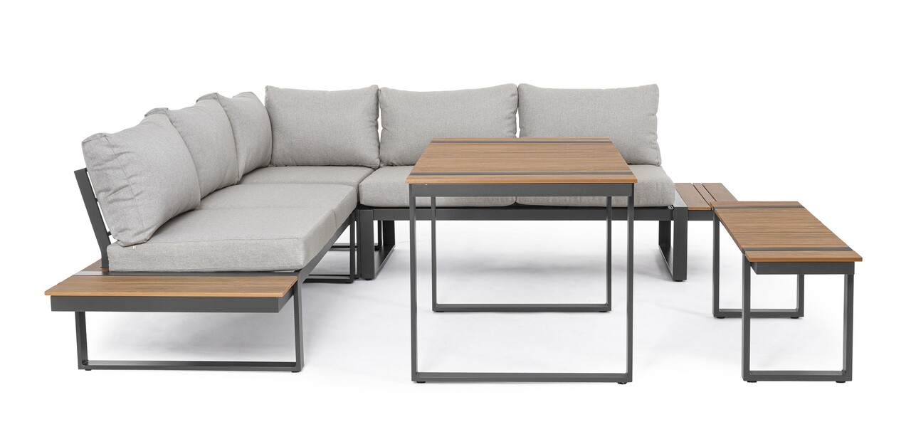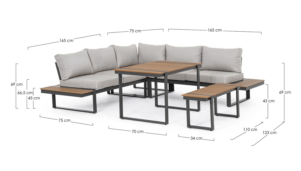 <p><strong>Mentiuni:</strong><br />Cadru din aluminiu acoperit cu pulbere (poliester). <br />Partile laterale si blatul mesei sunt din Polywood (material compozit cu aspect similar lemnului) 90% polistiren 10% Sbs in culoarea tec. <br />Perne detasabile cu huse din poliester. <br />Suruburi din otel galvanizat.<br />Necesita asamblare.<br />Inaltime sezut: 43 cm.<br />Inaltime spatar: 66.5 cm.<br /><br /><strong>Setul include:</strong><br />1 canapea cu dimensiunile 165 x 75 x 69 cm.<br />1 canapea cu dimensiunile 165 x 75 x 69 cm.<br />1 fotoliu de colt cu dimensiunile 75 x 75 x 69 cm.<br />1 masa cu dimensiunile 123 x 70 x 69 cm.<br />1 banca cu dimensiunile 110 x 34 x 43 cm.</p>