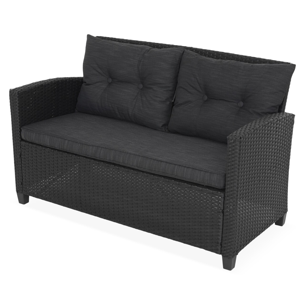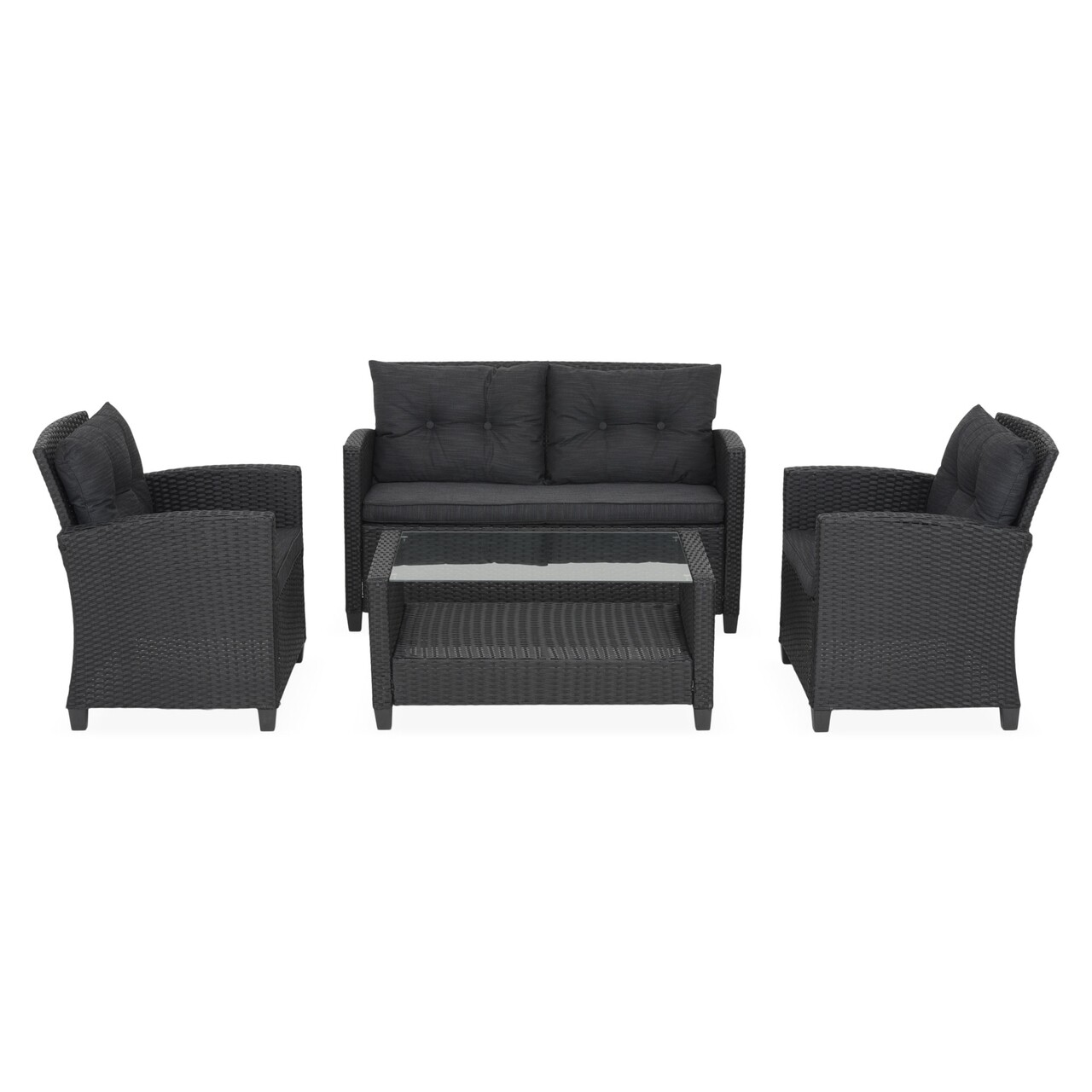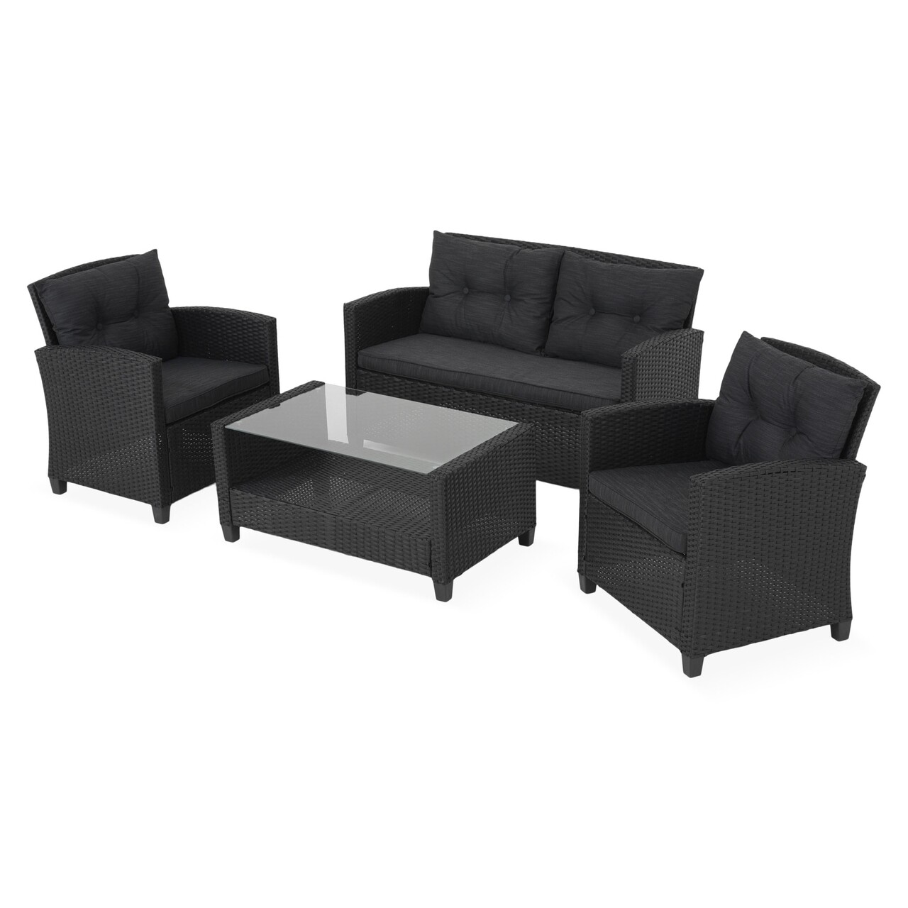 <p>Realizat din structura solida de otel vopsita in camp electrostatic si impletita cu fibre sintetice ce imita ratanul. Include perne din poliester cu protectie impotriva umezelii. Topul masutei este realizat din sticla securizata. <br />Dimensiuni:<br />canapea 2 locuri L.125 l.67 H.77 cm;<br />2 fotolii L.66 l.67 H.77 cm;<br />masuta L.92 l.55 H.43 cm.</p>