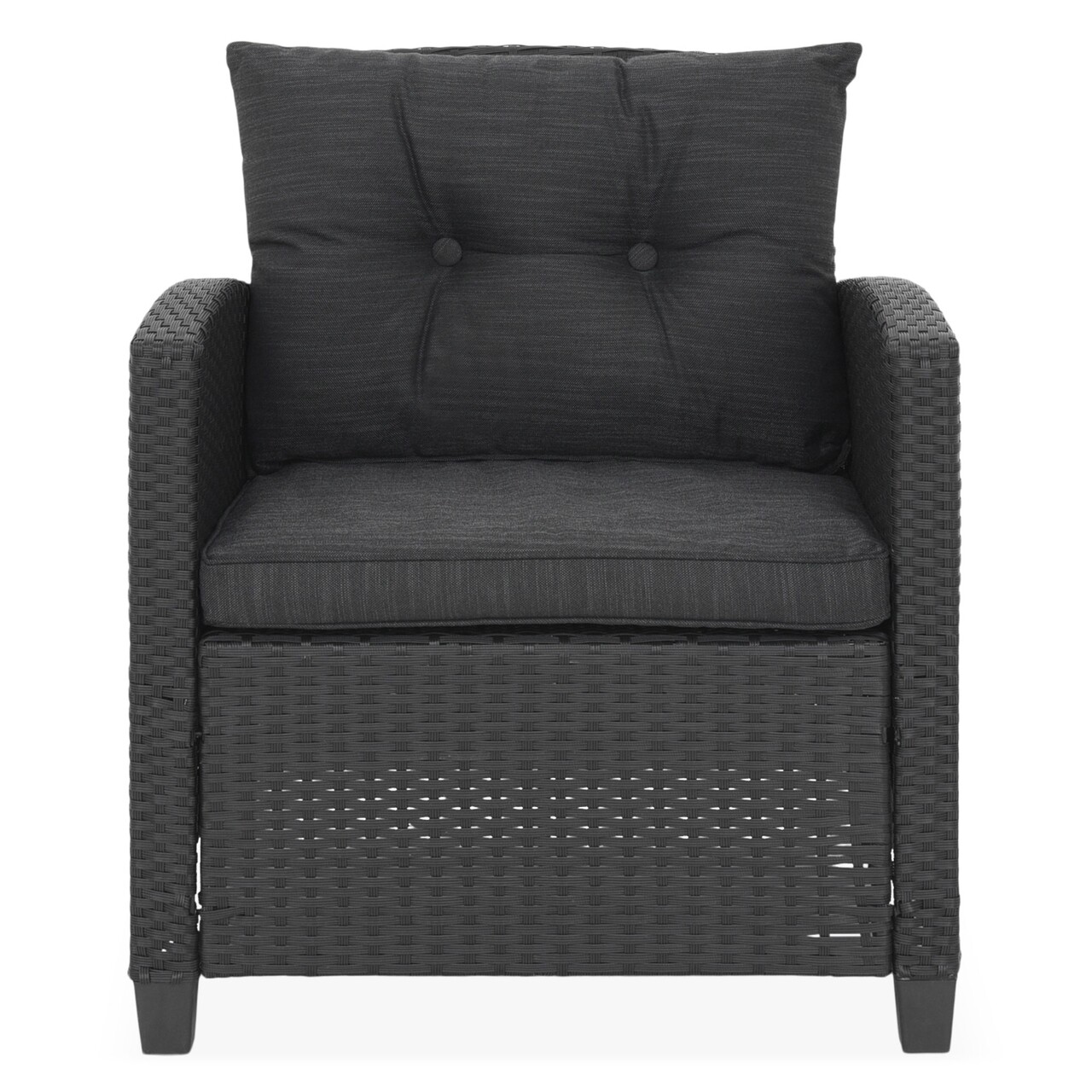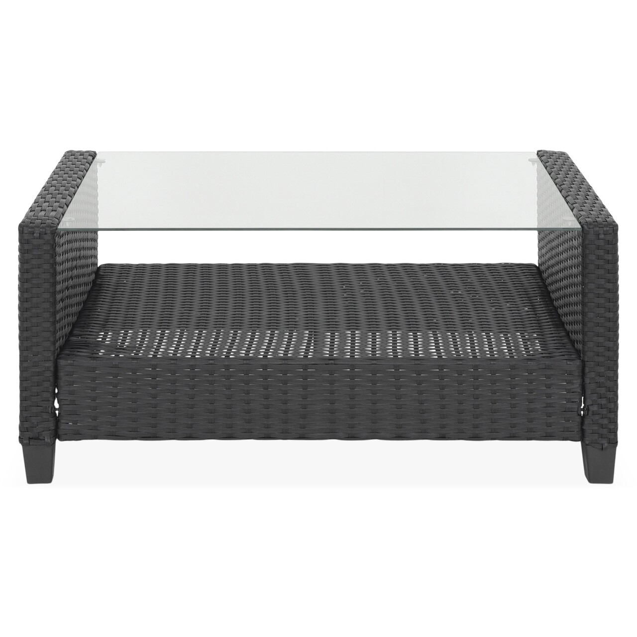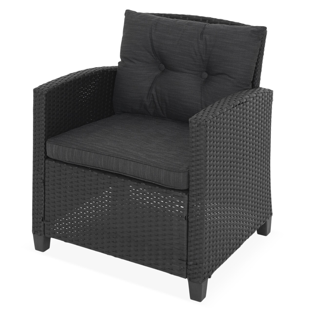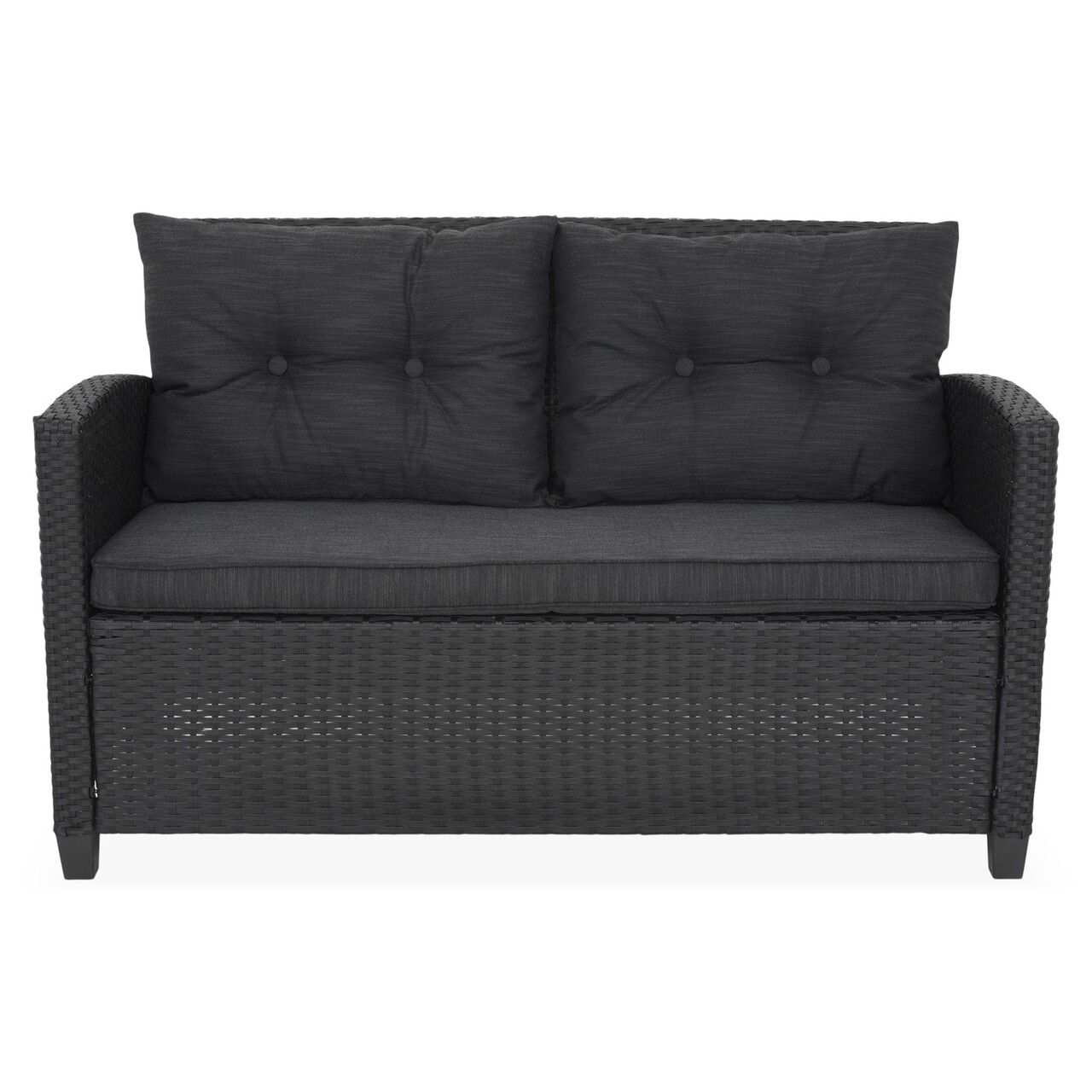 <p>Realizat din structura solida de otel vopsita in camp electrostatic si impletita cu fibre sintetice ce imita ratanul. Include perne din poliester cu protectie impotriva umezelii. Topul masutei este realizat din sticla securizata. <br />Dimensiuni:<br />canapea 2 locuri L.125 l.67 H.77 cm;<br />2 fotolii L.66 l.67 H.77 cm;<br />masuta L.92 l.55 H.43 cm.</p>