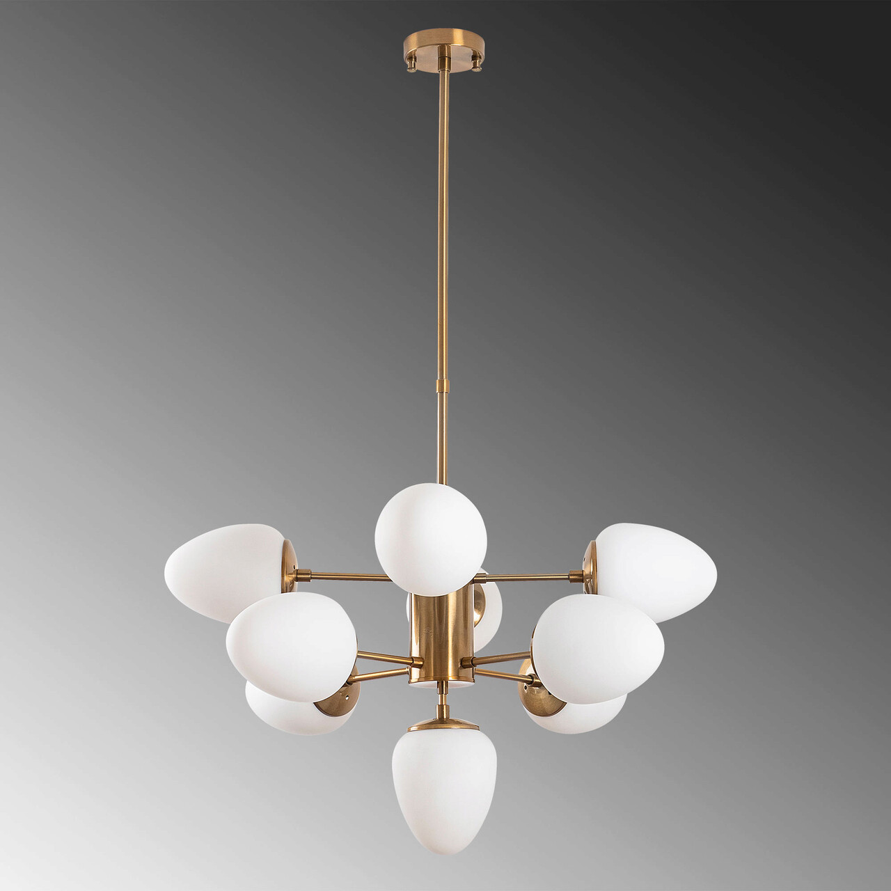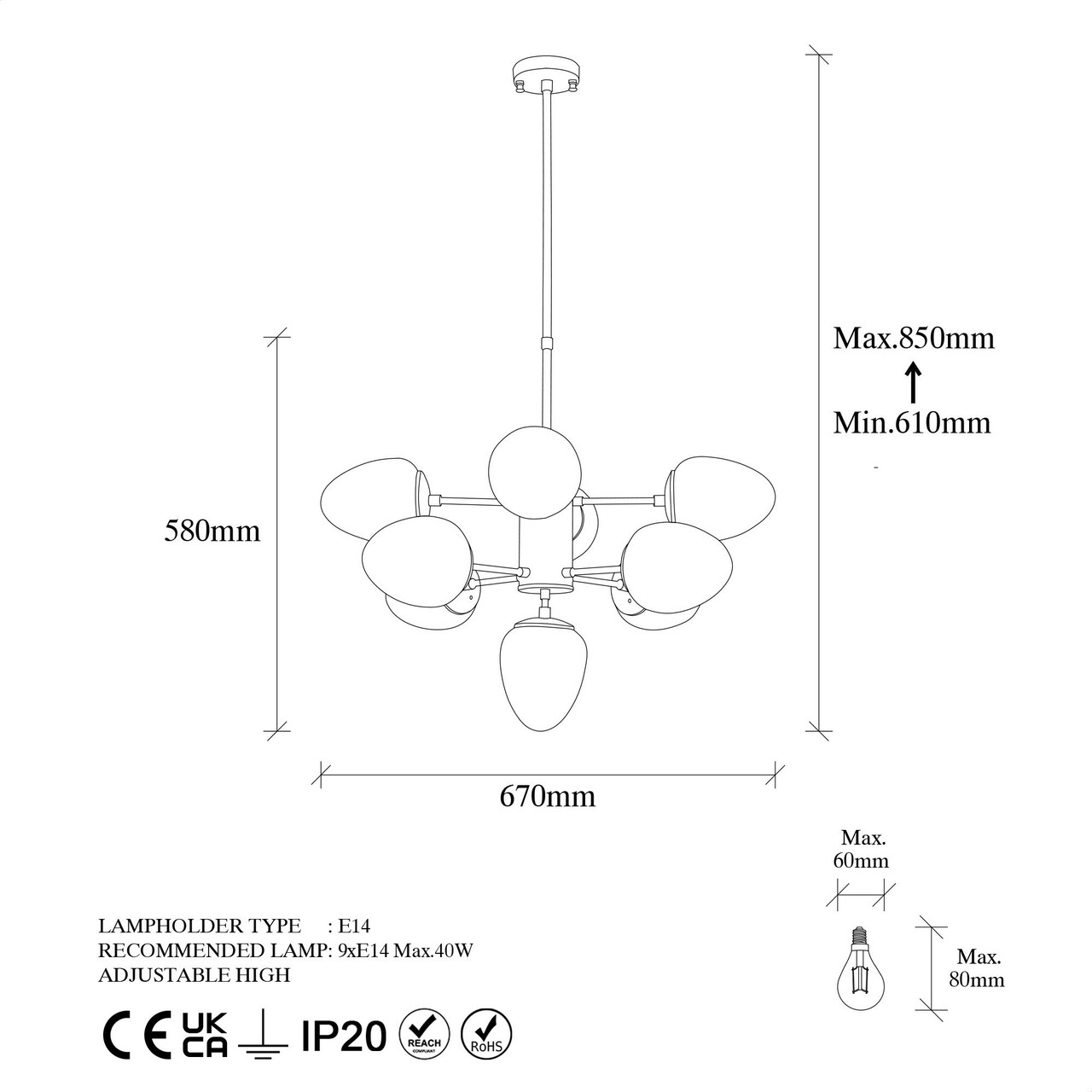 <p>Abajur din sticla<br/><br/>Baza metalica<br/><br/>Abajur (9 bucăți)<br/><br/>Diametrul abajurului: 12 cm<br/><br/>Inaltimea abajurului: 15 cm<br/><br/>Marime: 67 x 67 x 61-85 cm<br/><br/>Inaltime reglabila<br/><br/>Diametru baza: 12 cm<br/><br/>Inaltime baza: 3 cm<br/>IP20<br/>Tip soclu: 9 x E14 Max 40 W<br/></p>