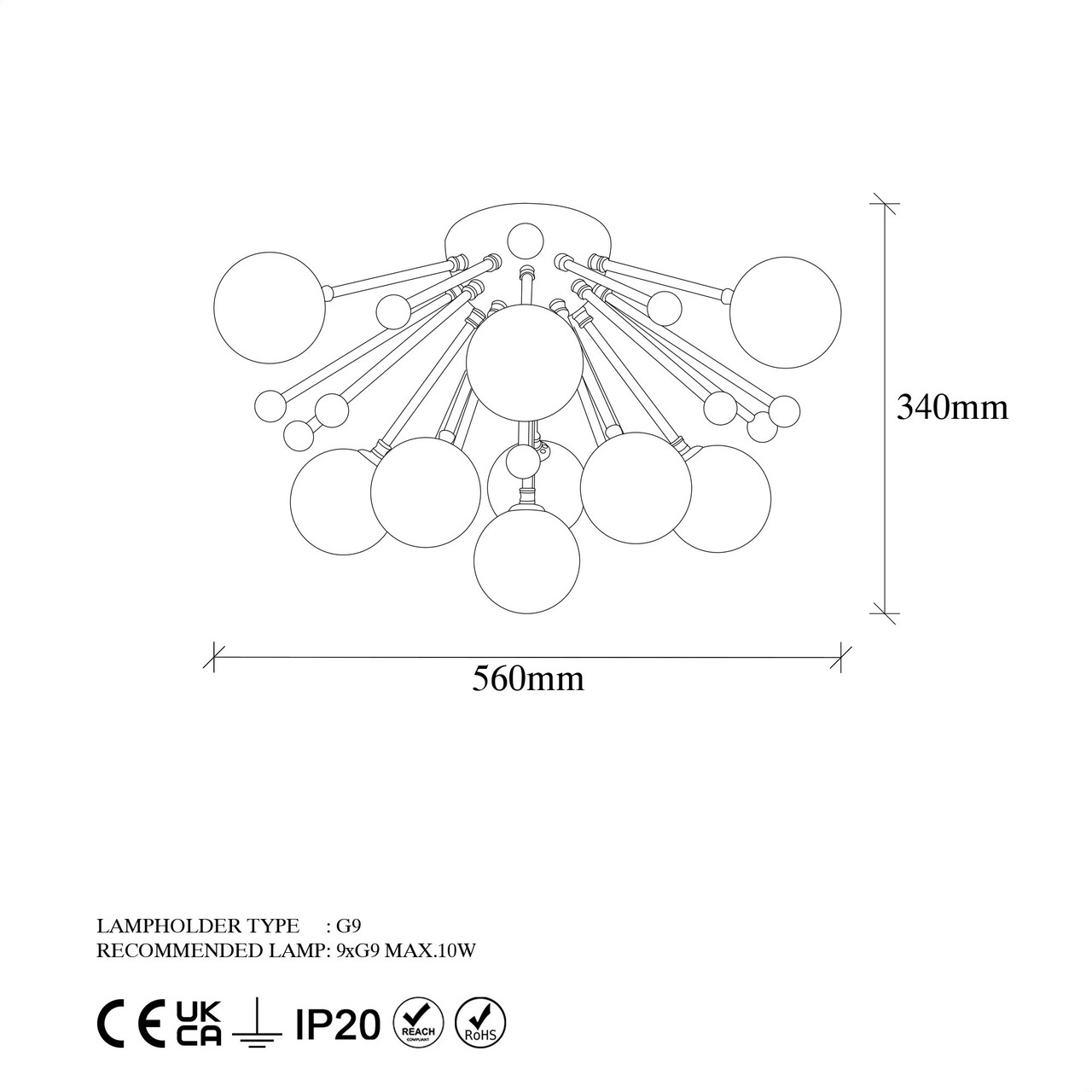 <p>Abajur din sticla<br/><br/>Marime: 56 x 56 x 34 cm<br/><br/>Diametrul abajurului: 10 cm<br/><br/>Becul nu este inclus<br/><br/>220 – 240 V<br/><br/>IP20<br/><br/>Tip soclu: 9 x G9 Max 10 W<br/><br/><br/></p>