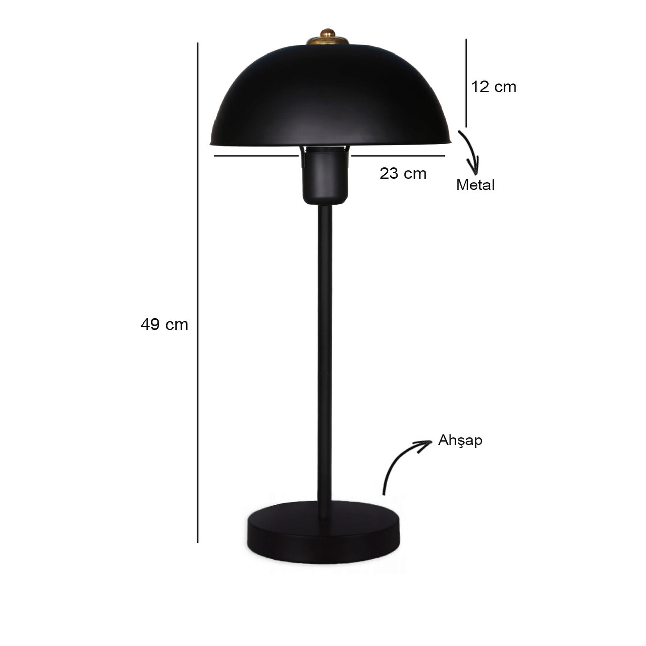 <p>Abajur metalic<br/><br/>Baza din lemn<br/><br/>Dimensiune abajur: 23 x 12 cm<br/><br/>Inaltime totala: 49 cm<br/><br/>Lungime cablu: 150 cm<br/><br/>Tip soclu: E27 Max 60 W<br/><br/><br/></p>