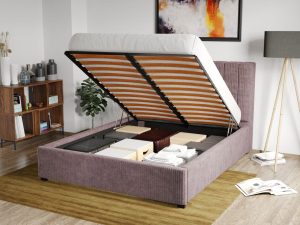 Pat Tapitat Adam cu somiera rabatabila si lada de depozitare Roz – Poso 27 140×200