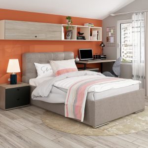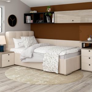 Pat tapitat copii GEORGIA, somiera rabatabila, lada depozitare, Stofa Bej