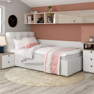 Pat tapitat copii GEORGIA, somiera rabatabila, lada depozitare, Piele eco Alba