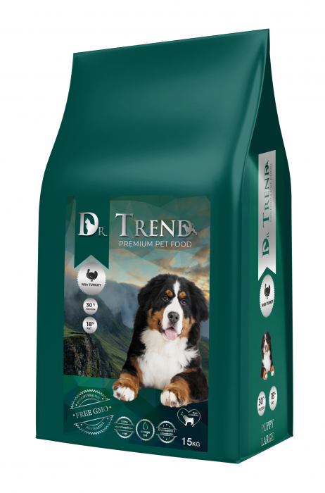 Dr.Trend Premium Hrana uscata completa pentru catei juniori de talie mare cu curcan, 15 kg Compozitie: proteine de pasare deshidratate (inclusiv 4 % de curcan), porumb, orez, gluten de porumb, grasime de pui, proteine de porc hidrolizate, pulpa de sfecla…