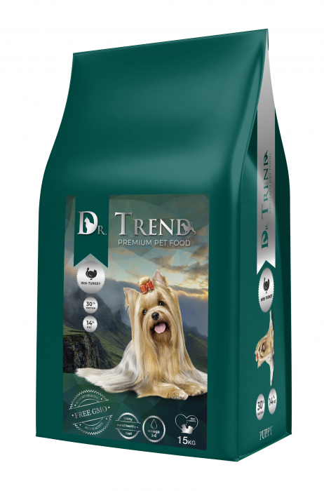 Hrana uscata completa Dr.Trend Premium pentru catei juniori de toate rasele cu curcan, 15 kg Compozitie: proteine de pasare deshidratate (inclusiv 4 % de curcan), porumb, orez, gluten de porumb, grasime de pui, proteine de porc hidrolizate, pulpa de sfecla…