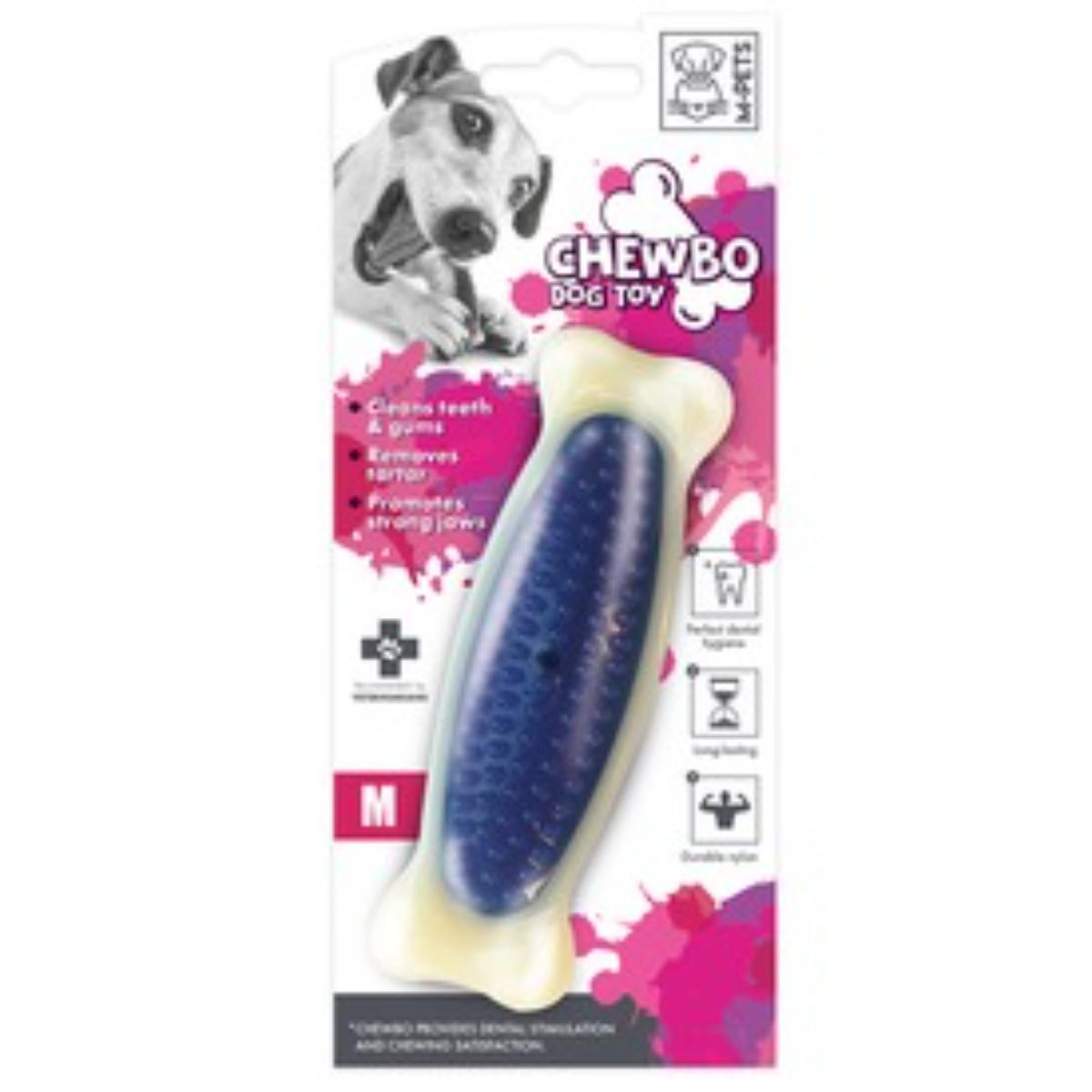 M-PETS Chewbo Bone, jucărie de ros, aromă Bacon, câini, dentiție, cauciuc M-PETS Chewbo Bone, jucărie de ros, aromă Bacon, câini S-M, dentiție, cauciuc, alb și albastru, 14cm