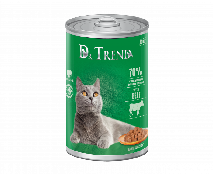 DR. TREND Hrana conservata completa cu carne de vita in sos delicat pentru pisici adulte de toate rasele, 10 conserve a cate 400g. Compozitie: carne si produse de origine animala (70% din carne si produse de origine animala in bucati, 4% carne de vita),…