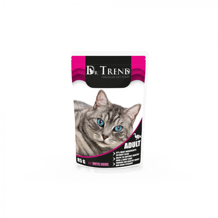 Hrana umeda completa Dr.Trend Premium pentru pisici cu rata, 12×0,085g Compozitie: 81% carne si derivati de origine animala in felii (de pasare; de porc; inclusiv 4% de rata; de vita), cereale, extracte de proteine vegetale, minerale, peste si derivati…