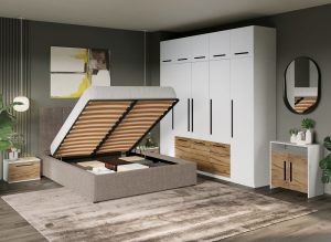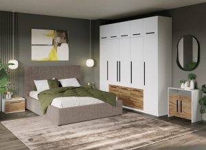 Set Mobila Dormitor Noce T6 cu Pat Tapitat